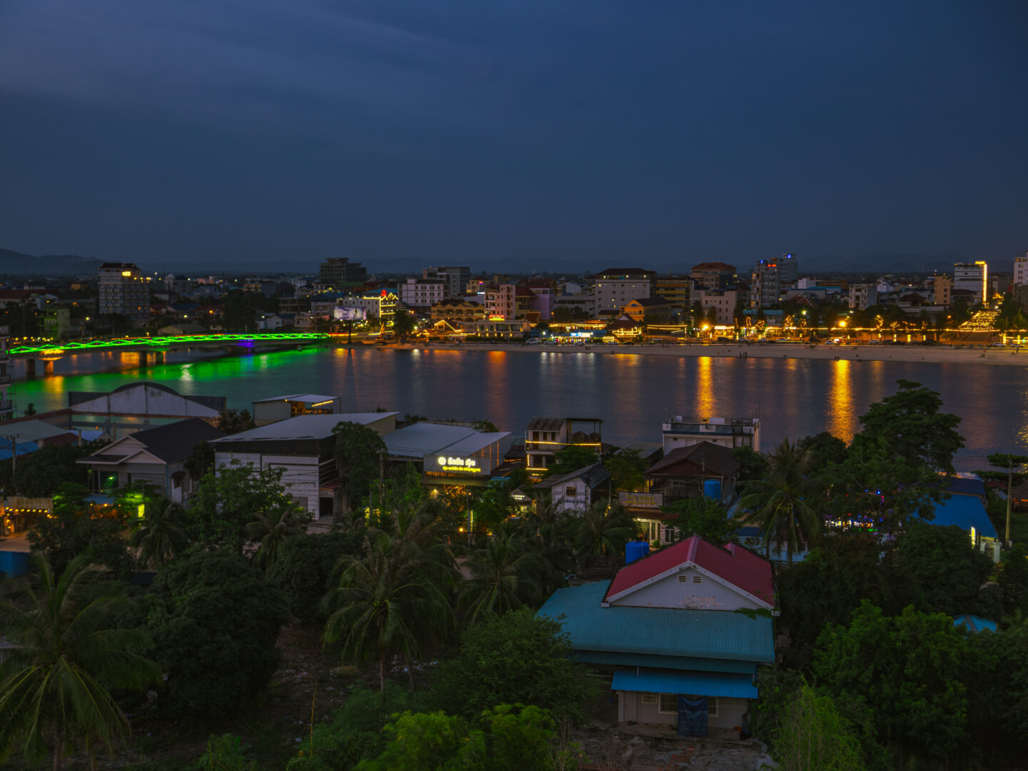 カンポットのホテルからの景色。目の前には「プリーエック・タエック・チュー川」が広がりカンポットの夜景が水面に映り込んでいます。美しい景色だったので手持ちハイレゾショットで高精細に撮影。三脚不要でハイレゾショットが使えるのは旅カメラとして完璧。特に景色などは少しでも鮮明に写しておきたいと思うことが多いので、小さなカメラで高解像撮影ができるというのはそれだけで楽しいしモチベーションが上がります。