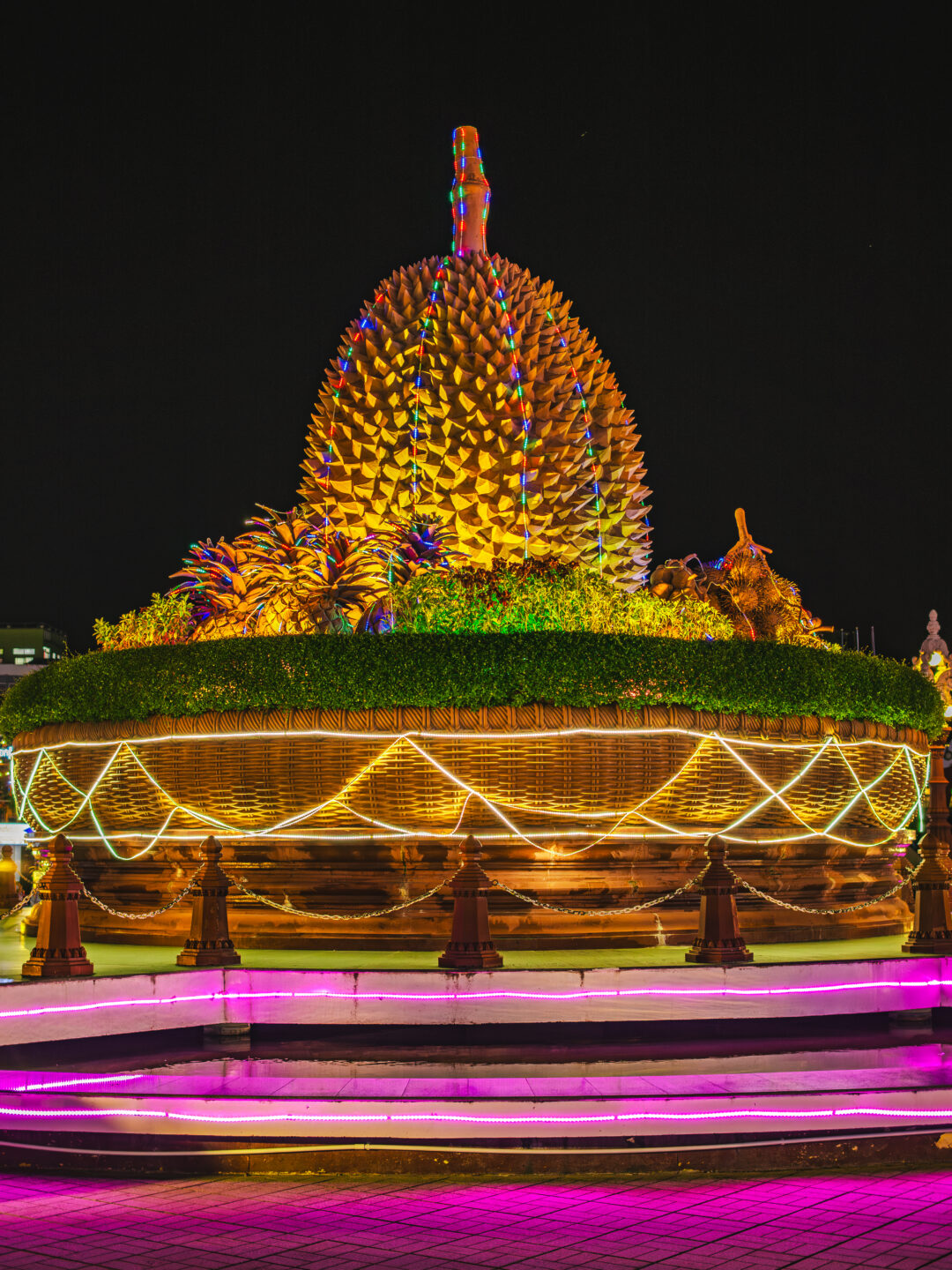 カンボジアにはラウンドアバウト(円形交差点)が多くありその中心部にはよくオブジェが設置されています。夜市の近くのラウンドアバウトには光り輝くドリアン。独特。