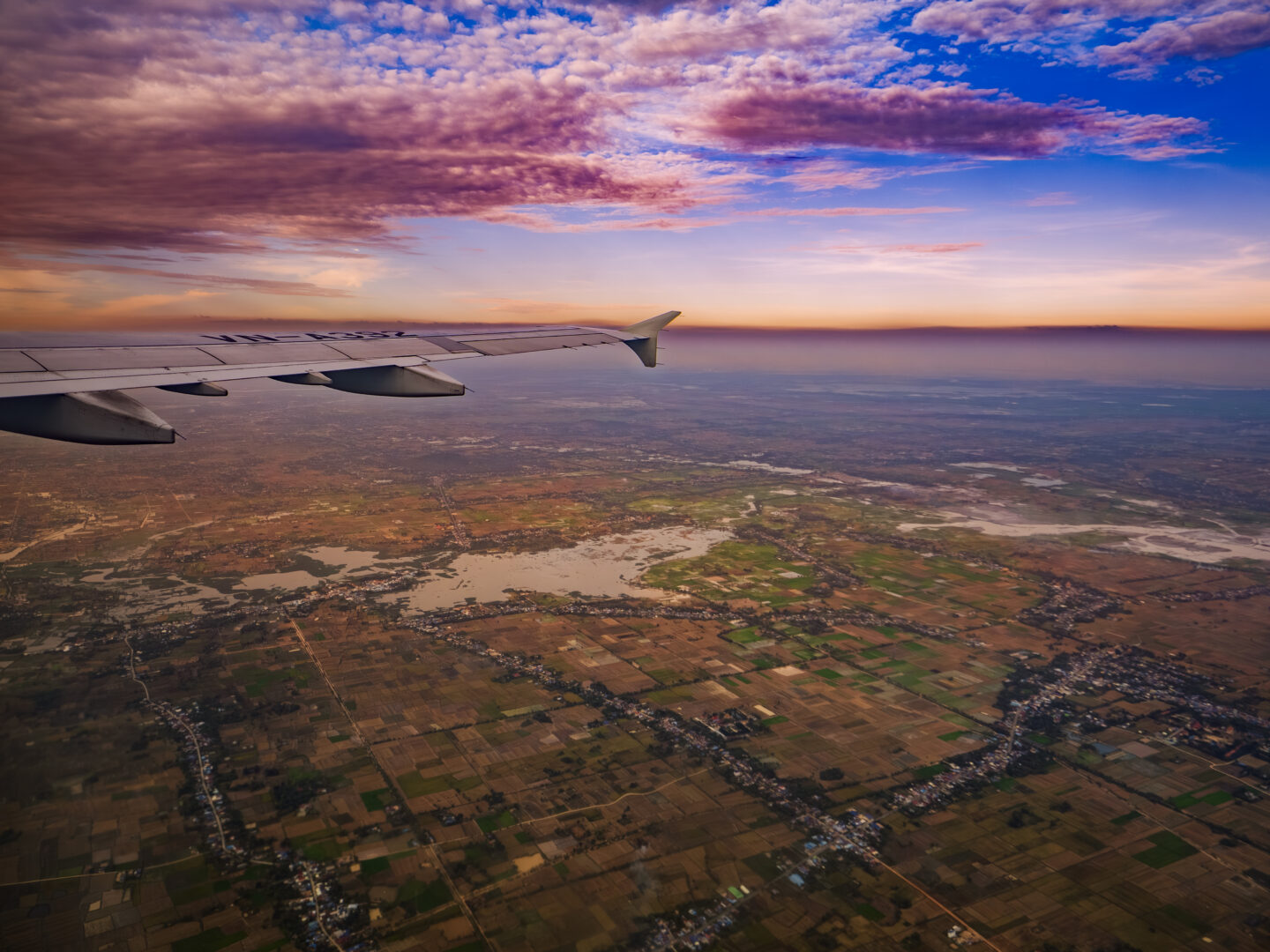 カンボジア上空。 日が傾きはじめ、 空に少しずつ朱が差しはじめます。