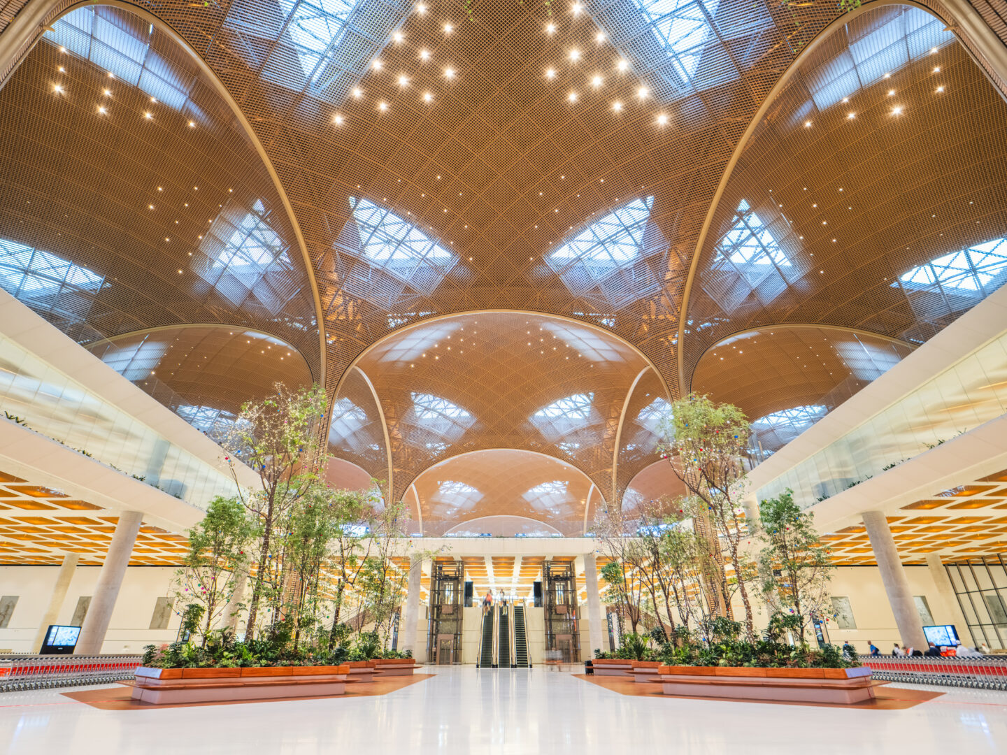 テチョ国際空港のアトリウム空間。 シンメトリーの美しいデザインが印象的。 35mm判換算16mmの超広角でも狭く感じるほど、 圧倒的な広さがあります。
