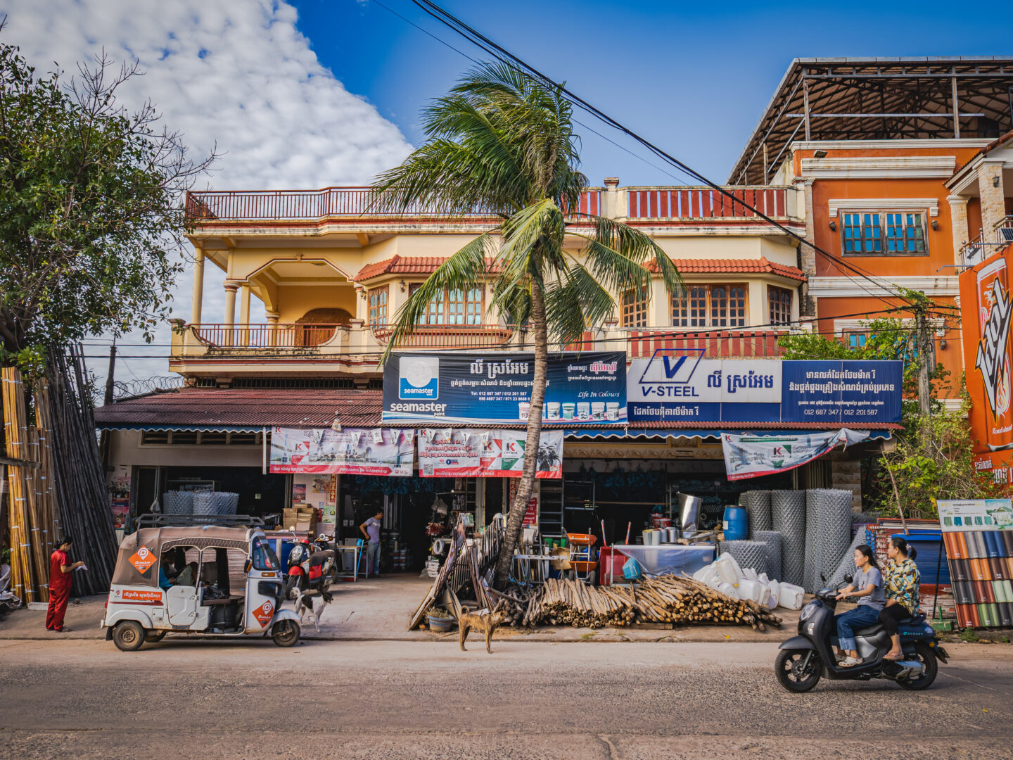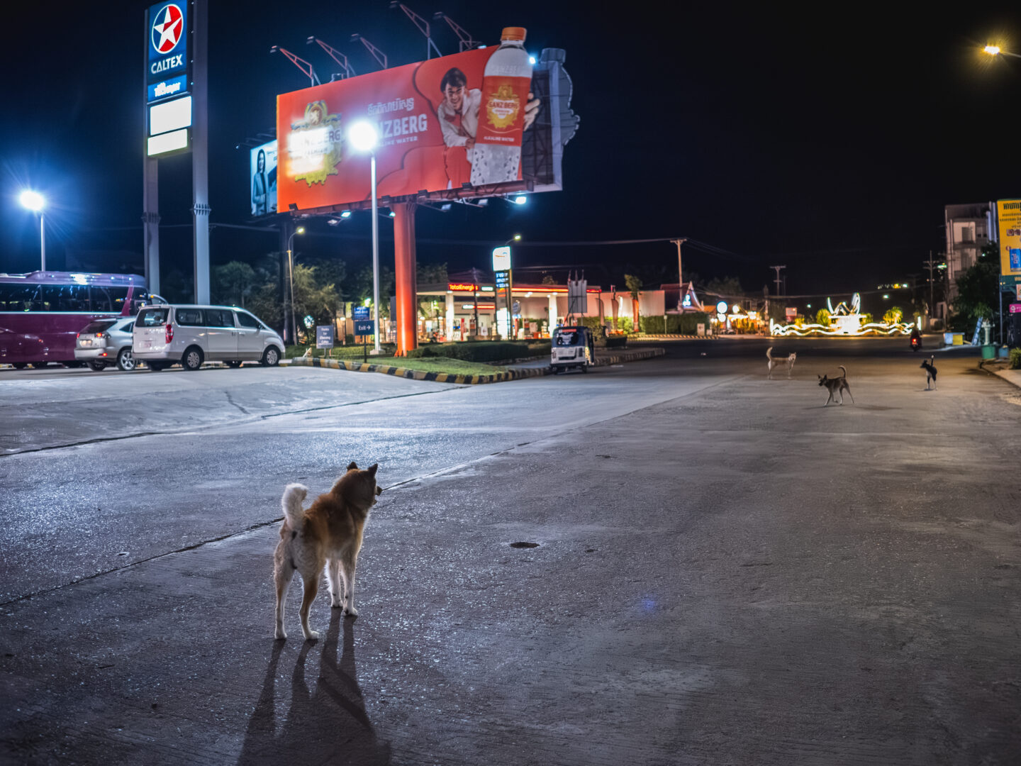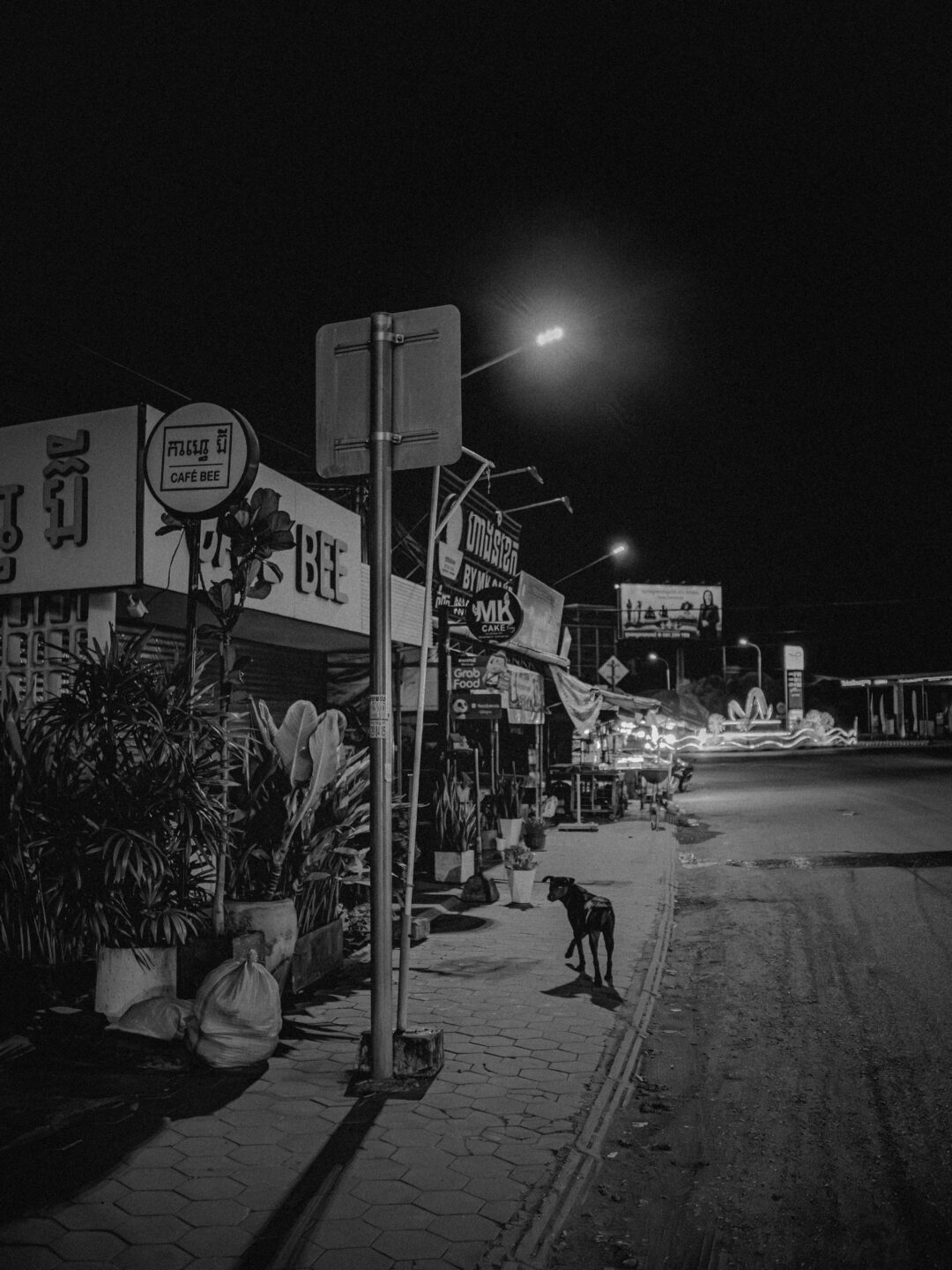一方で、 今回私が主に滞在しているカンポットは、 シェムリアップに比べるとずっと素朴で、 のんびりとした空気が流れています。 繁華街らしい場所もあるにはありますが、 それも街のごく一部だけ。 もしかすると、 みなさんが思い浮かべる「カンボジアらしい風景」は、 こうしたカンポットのような土地の雰囲気に近いのかもしれません。私はこの景色と空気感が好きです。 ここにいるだけで気持ちが落ち着きます。このまま眠ってしまうのも少し惜しくて、 宿の近くをOM-3片手に少しだけ散歩することにしました。 カンボジアでは放し飼いの犬、 あるいは半分野良のような犬たちを本当によく見かけます。 彼らはあたりまえのように道を歩き、 ときには気づかないうちに私の後ろへ連なってついてきていることもあります。