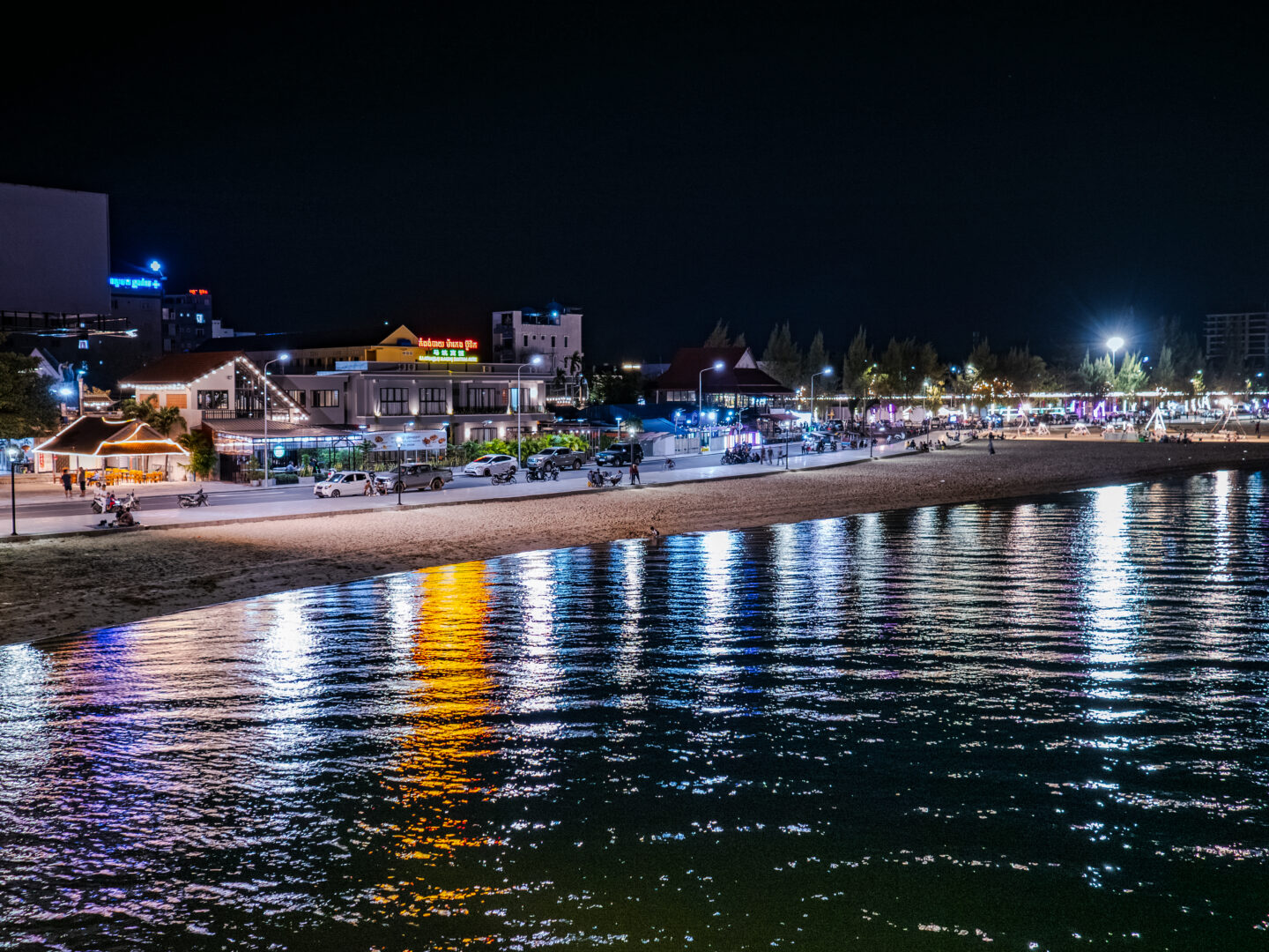 カンポットの夜景。 街の明かりが川面にやわらかく反射しています。