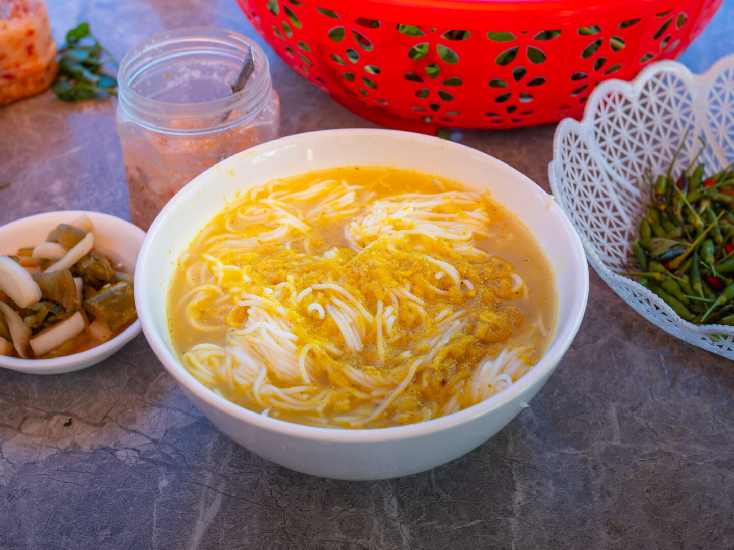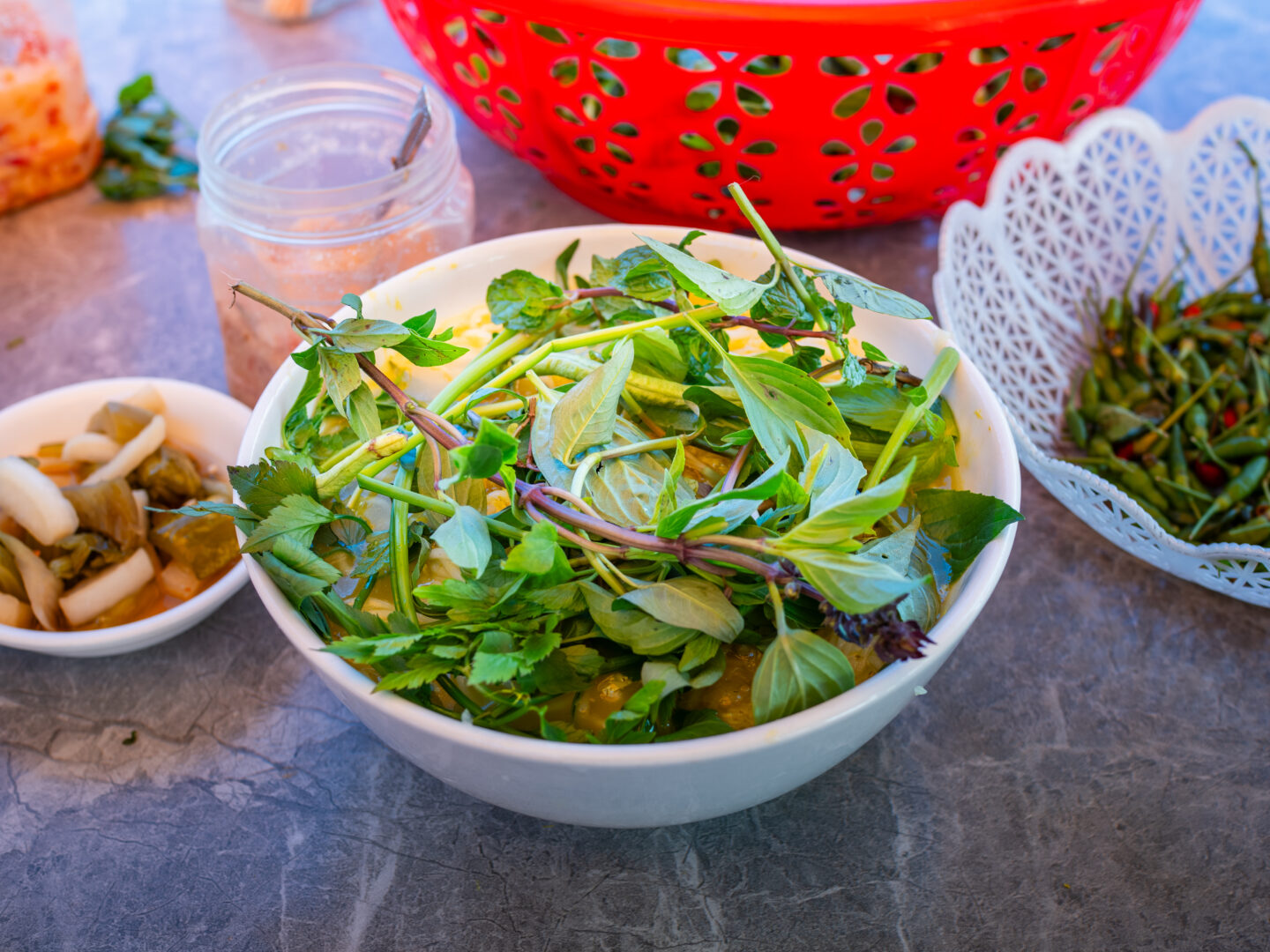 スープは「プラホック」と呼ばれる魚の発酵調味料に、「クルーン」と呼ばれる香草のペーストを合わせたもので、 独特の味と香りがあります。 とはいえ、 発酵食品に慣れた日本人には案外親しみやすく、 すっと馴染む味でもあります。食べ方は、 そのままでもいい。 けれど、 香草が入れ放題なので、 好きなだけ手でちぎって加え、 自分好みに仕上げてもいいです。私は麺と香草が1:1になるくらい、 山盛りにして食べるのが好きです。そういう、 いい意味での雑さが、「ああ、 カンボジアに戻ってきたな」と感じさせてくれます。