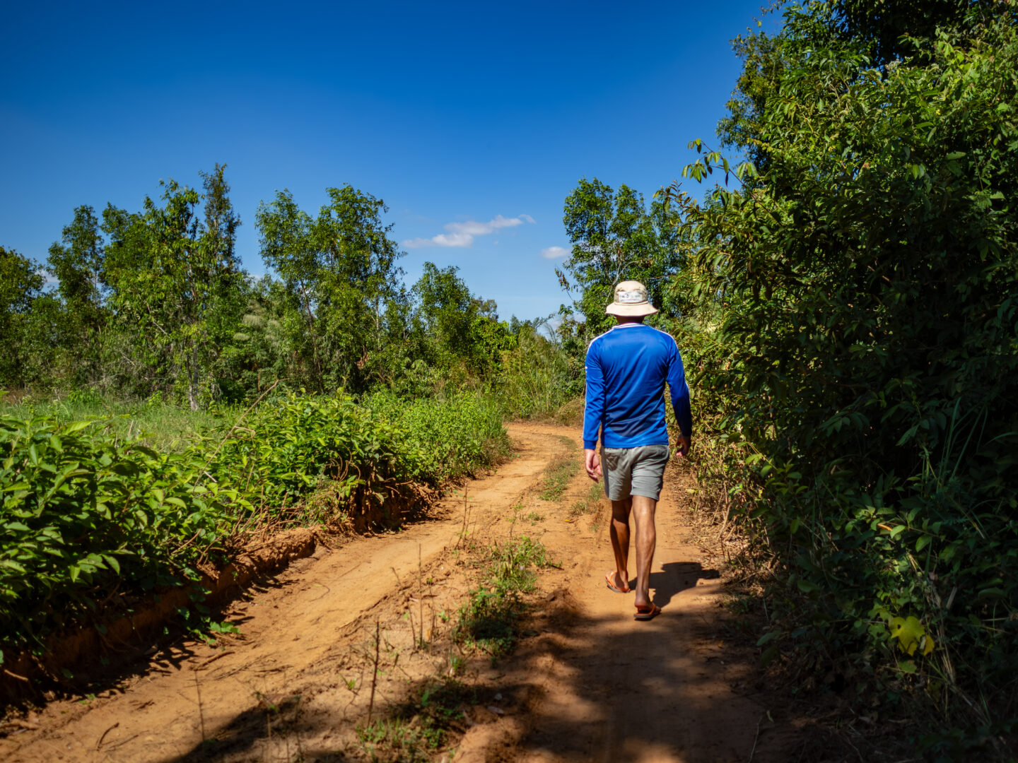朝食を食べたら胡椒畑へ向かます。 畑までは宿から車で1時間もかかりません。 前回はバイクを借りて向かいましたが、 車だと土埃を気にせずに済みますし、 天気にも左右されにくいです。 前回は雨季だったので、 しっかり雨にも打たれました。胡椒畑に到着すると、 職人さんたちが出迎えてくれました。