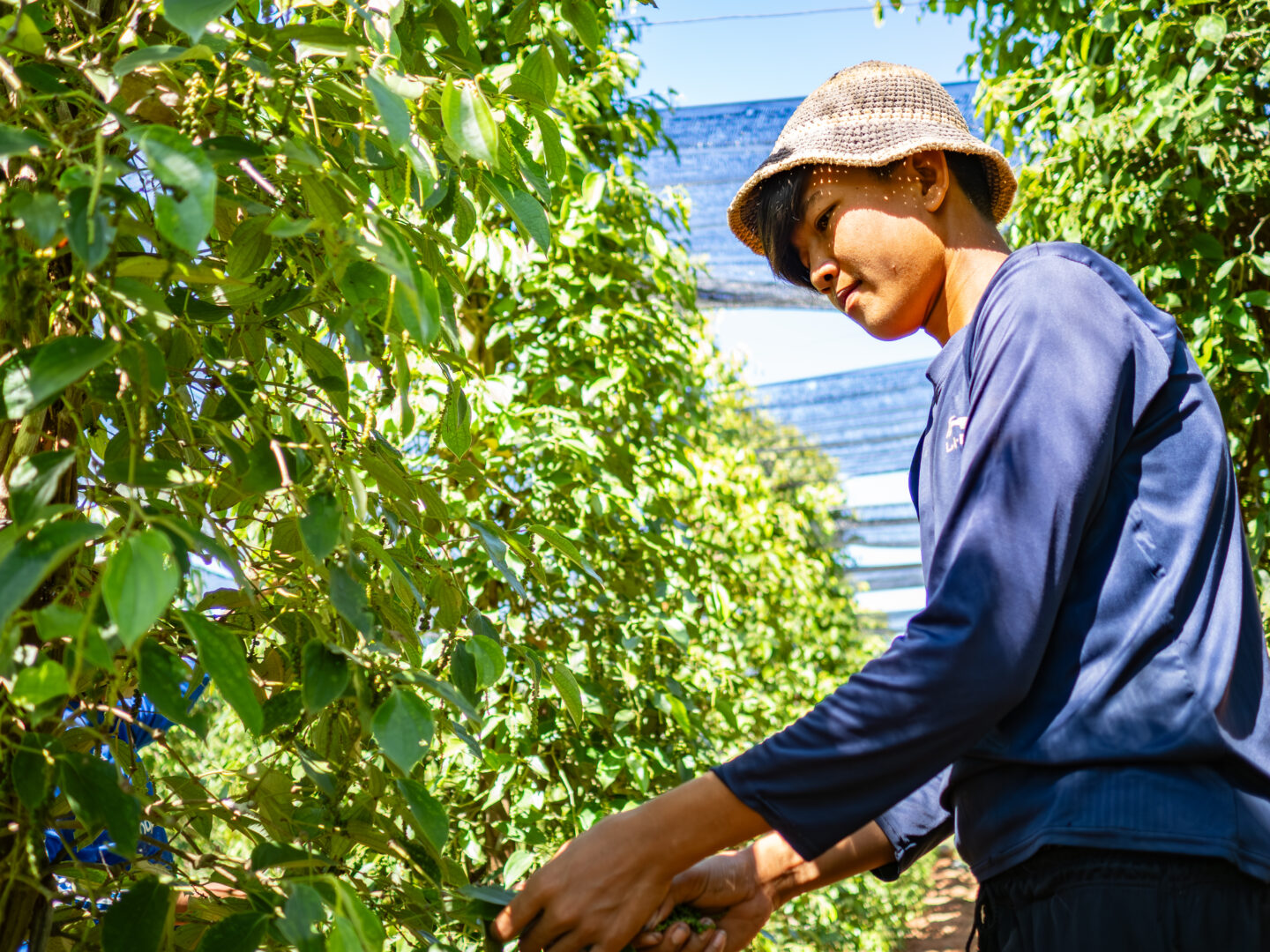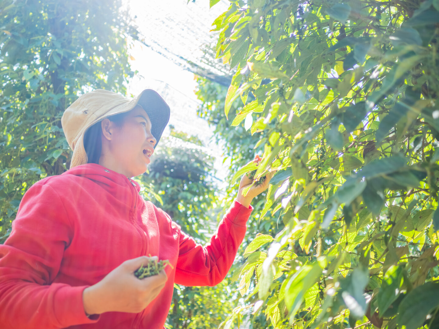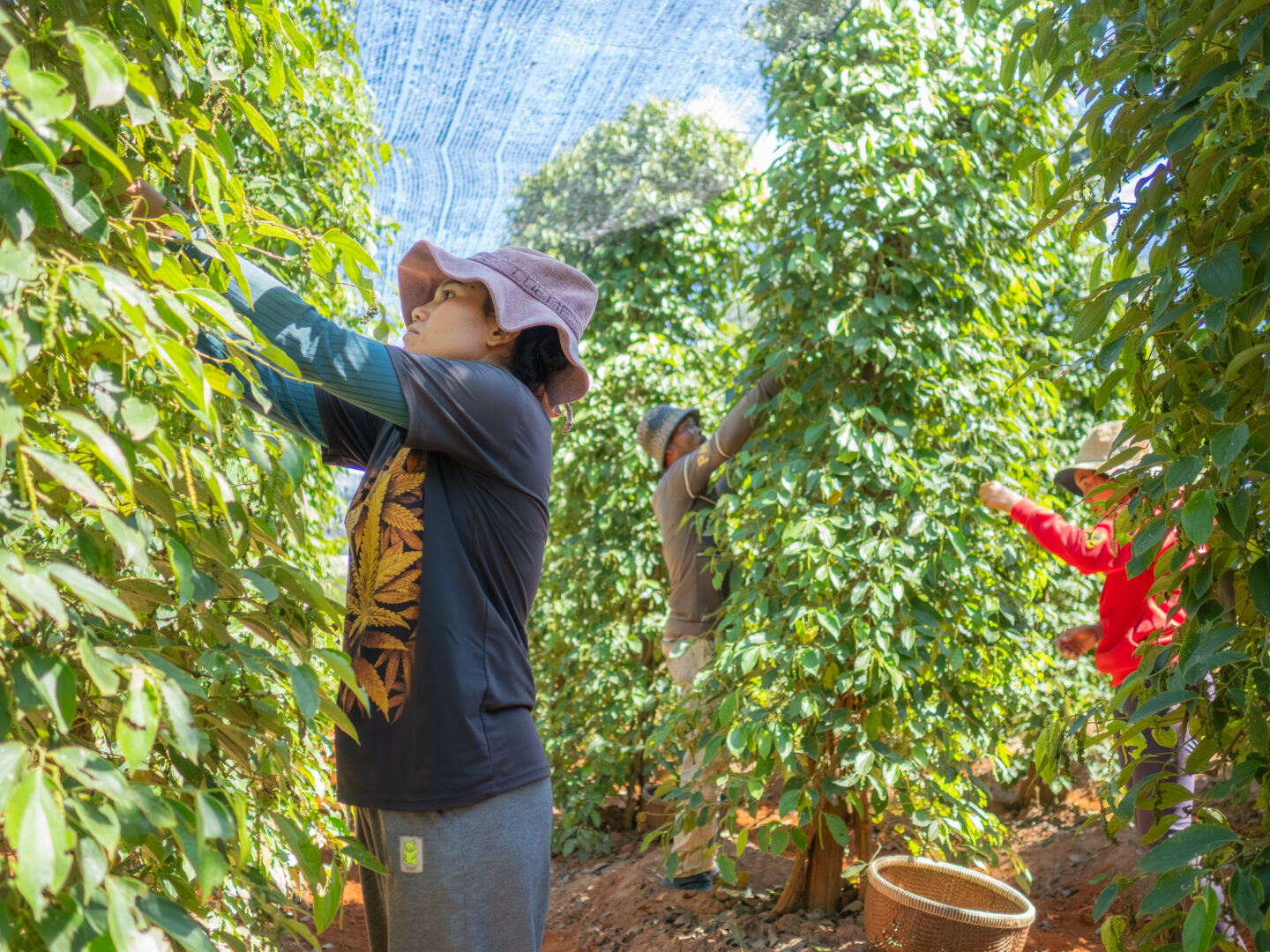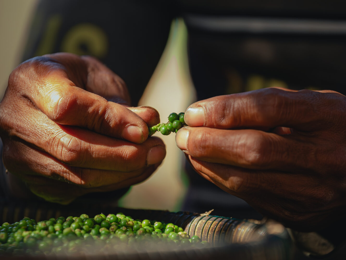 胡椒の収穫は、 まさに人海戦術。 日ごとに成長していく胡椒を、 職人さんたちが一斉に摘み取っていきます。