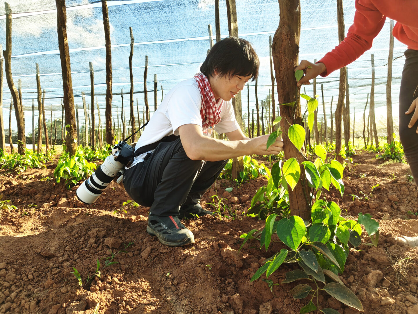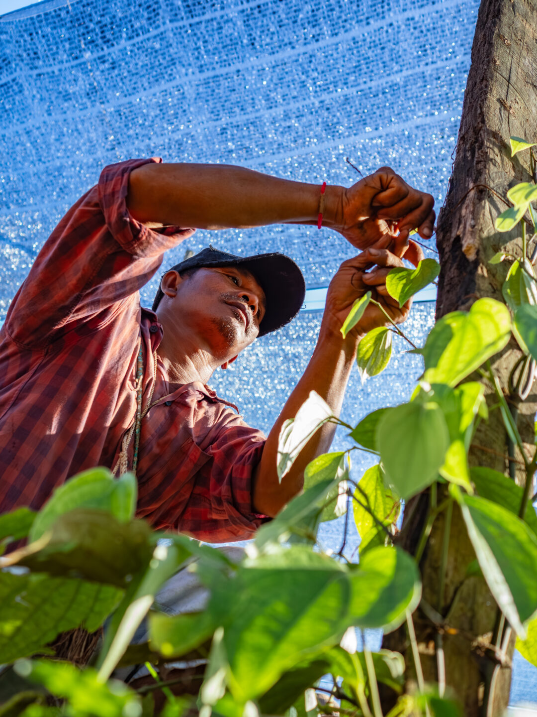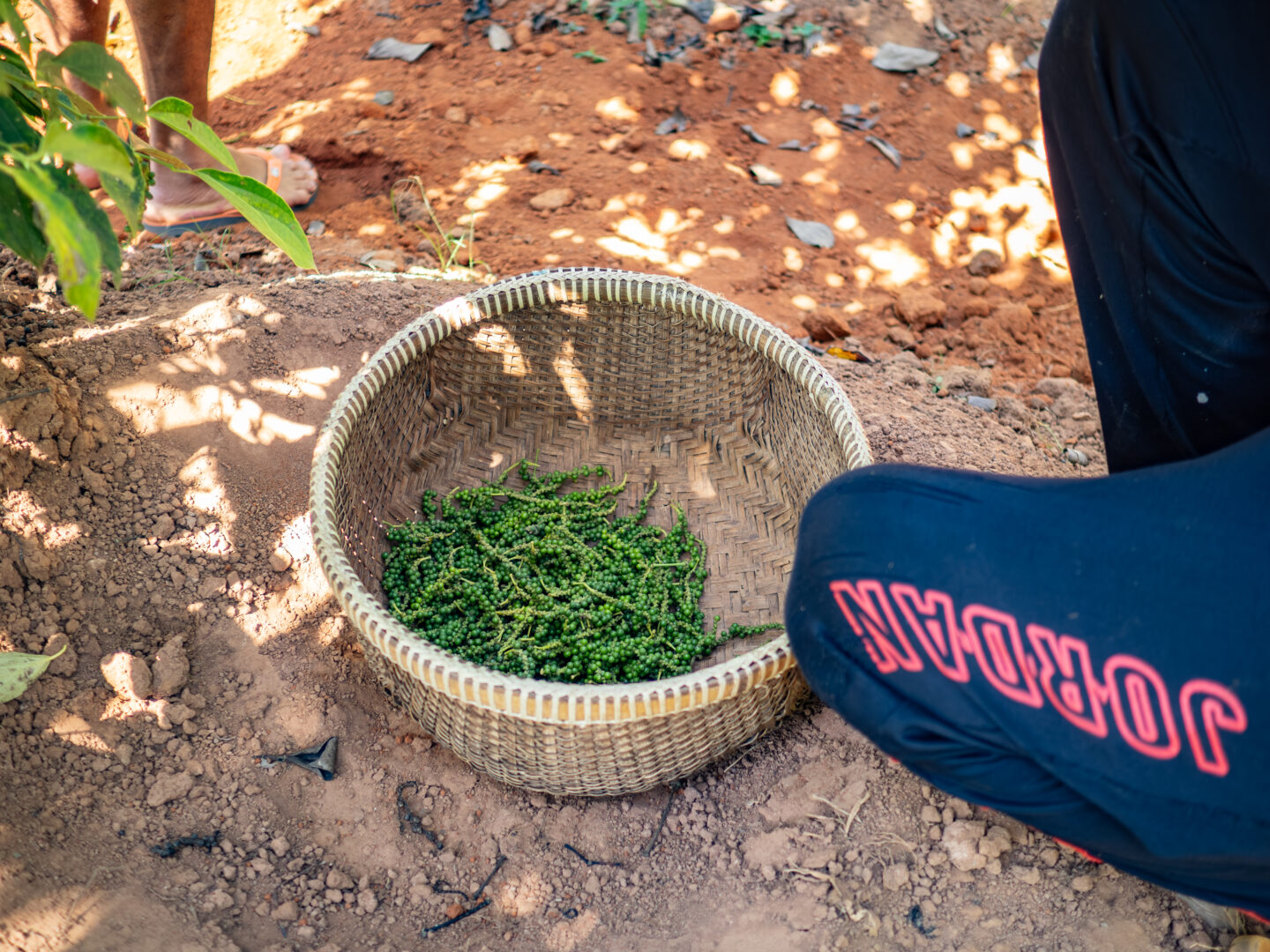 午後からは、 職人さんたちに協力していただき、 胡椒の収穫風景を取材させていただくことになりました。 前回訪れたのは雨季だったため、 収穫よりも畑の手入れや準備の作業が中心で、 なかなか撮ることのできなかった場面のひとつです。