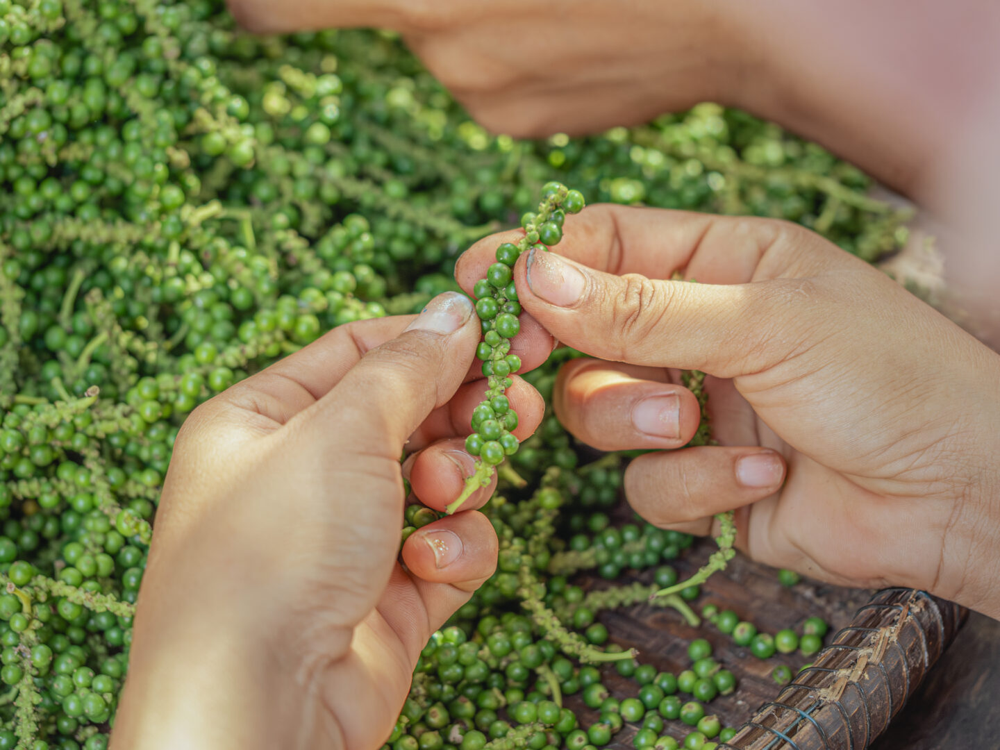 胡椒の実の収穫が終わると、 次は「脱粒作業」です。 読んで字のごとく、 粒を外していく作業のことで、 先ほど収穫した生胡椒の実を一粒ずつ手作業で房から外していきます。この脱粒作業を経ると、 収穫した胡椒の重量はおよそ半分になるらしいです。