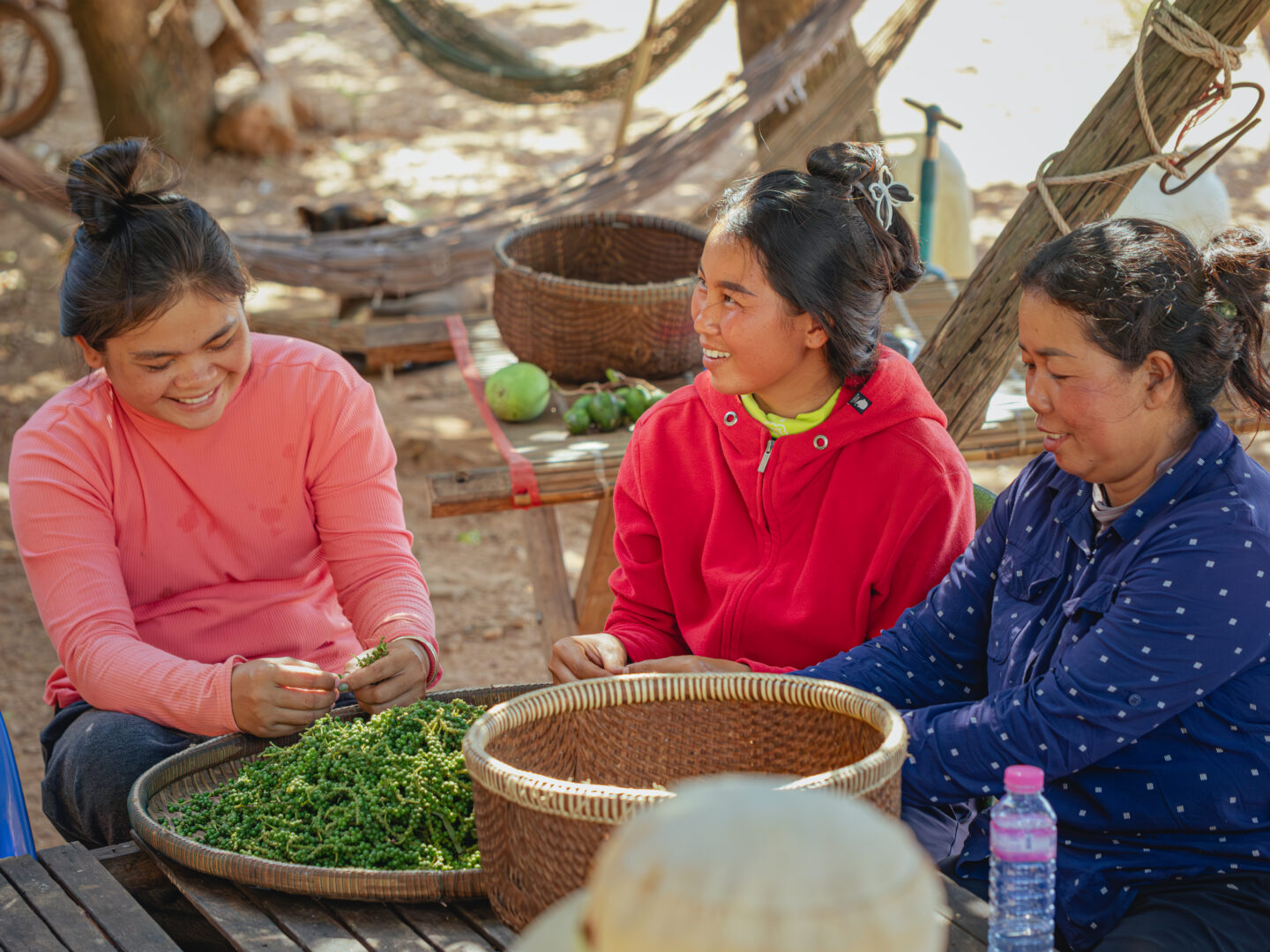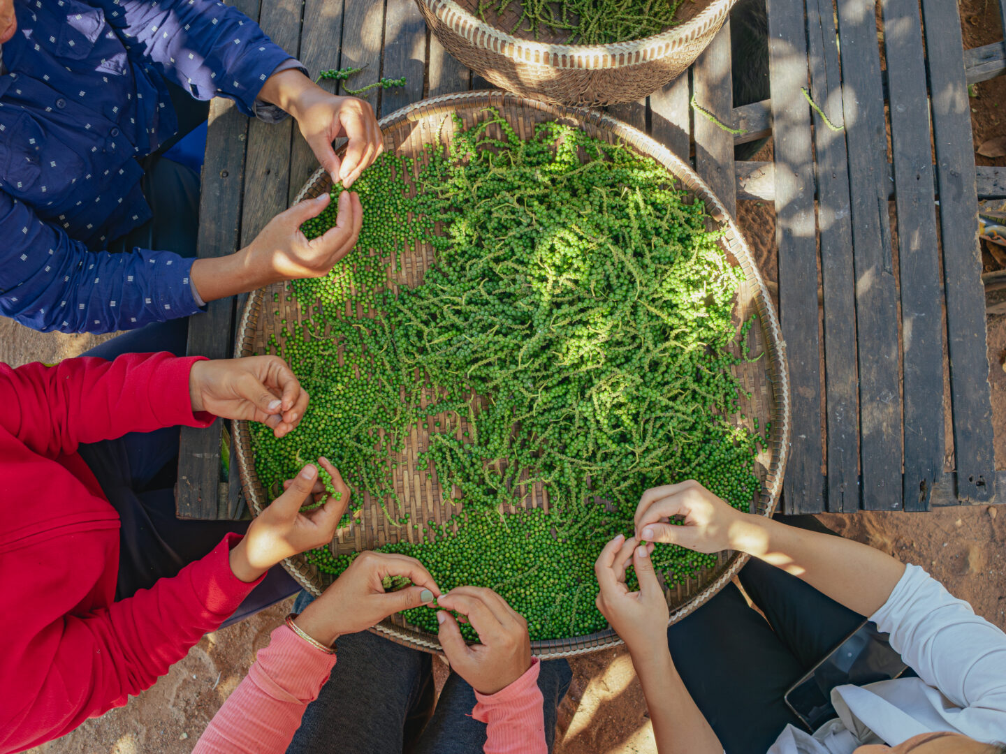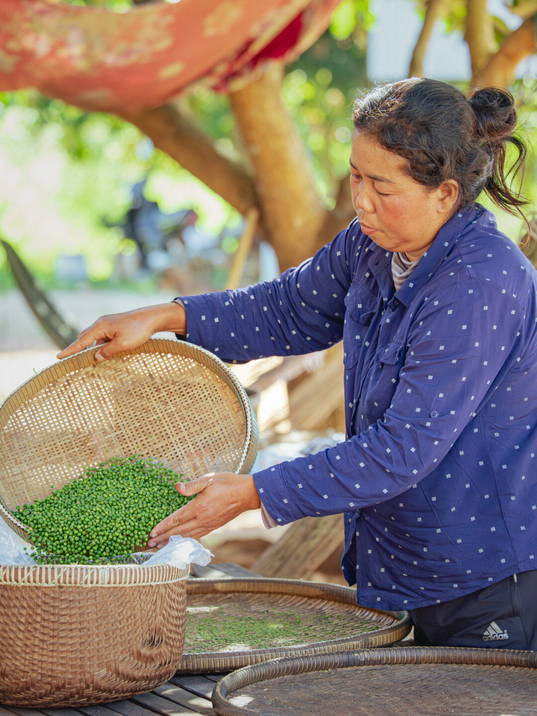 撮影に夢中になっているうちに、 山盛りだった生胡椒も、 職人さんたちの手にかかればあっという間に粒だけになっていきます。その生胡椒の粒がとても美しく、 まるで宝石のようだと思うほど、 きらきらと輝いていました。生胡椒は日本ではなかなか食べる機会がなく、 口にすることがあるとしても、 塩漬けにされたものがほとんど。けれど、 ここカンボジアでは本当の生胡椒を味わうことができます。 カンボジアを訪れた際は、 ぜひ一度食べてみてほしいです。