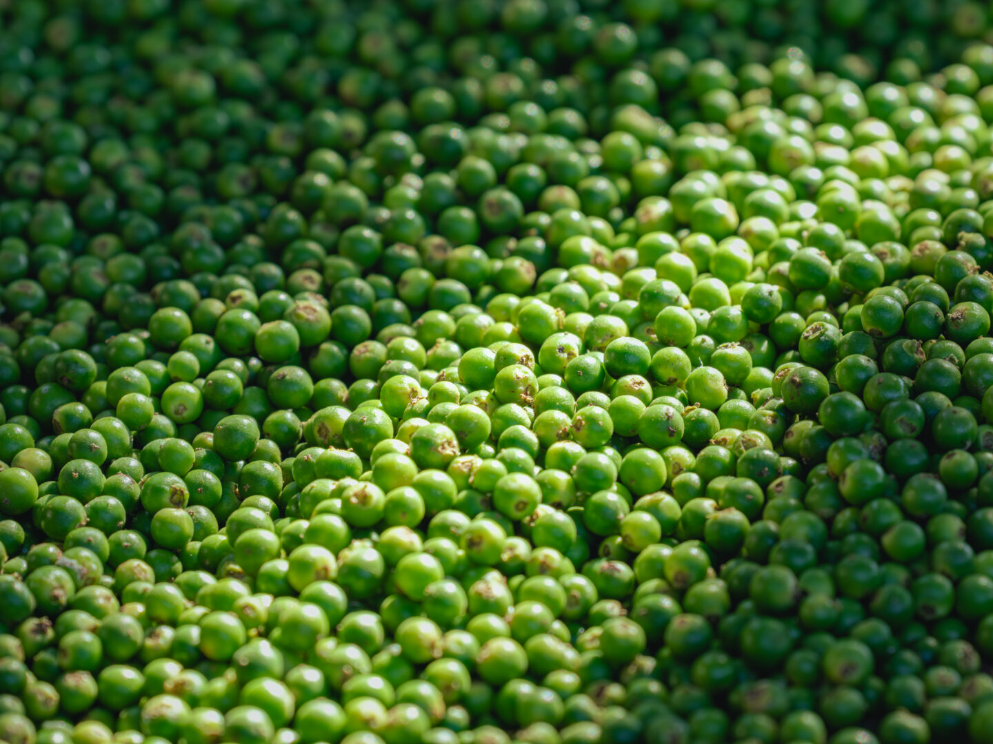 脱粒された生胡椒の実の山。 まるで宝石のような輝きを放っています。
