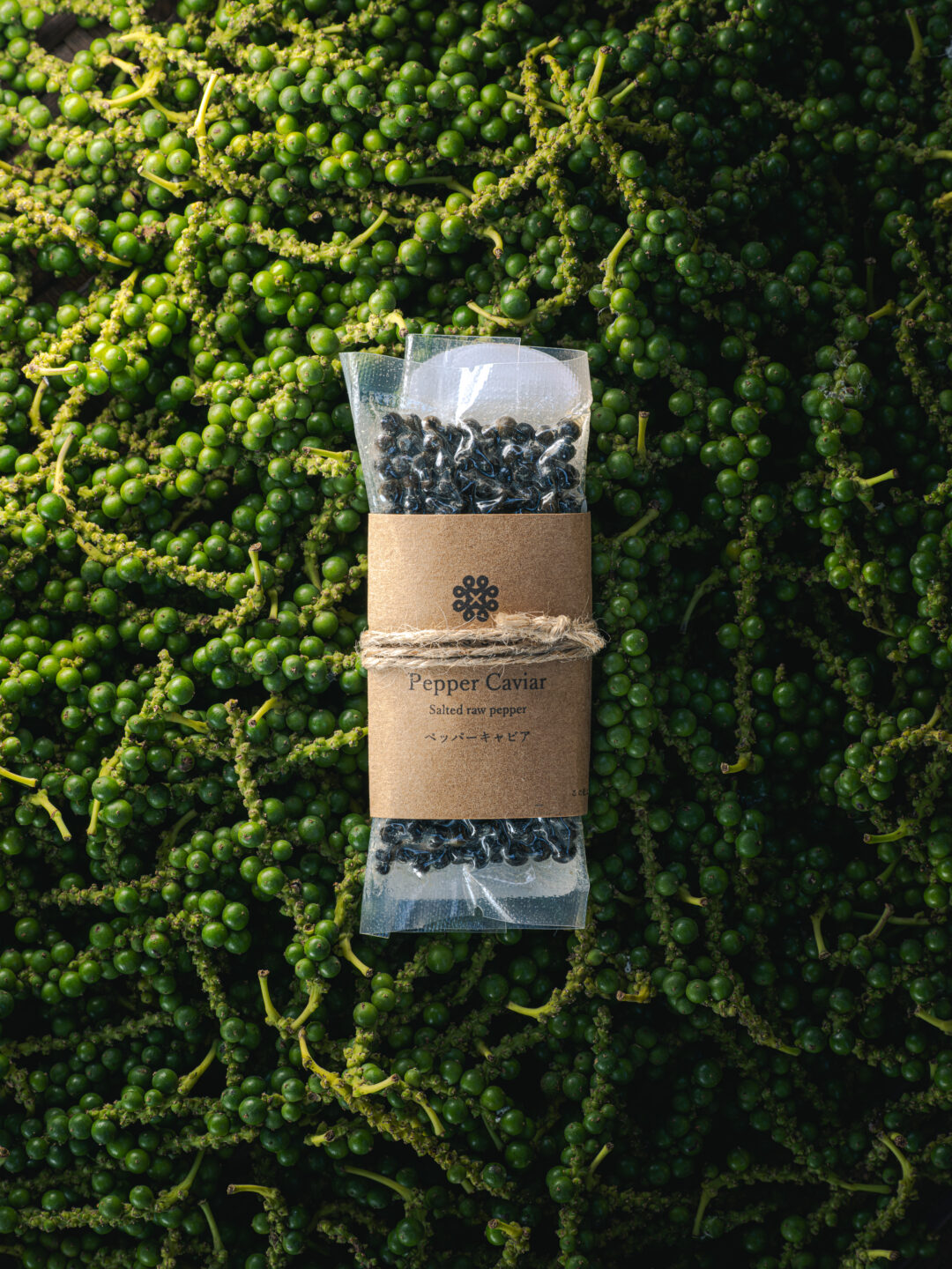 これが、 木下レイナさんがRAYS SHOPで販売しているペッパーキャビア。もともとは綺麗な緑色の粒ですが、 加工の段階で黒胡椒のような色味へと変わっていきます。 お酒のお供にもぴったりです。