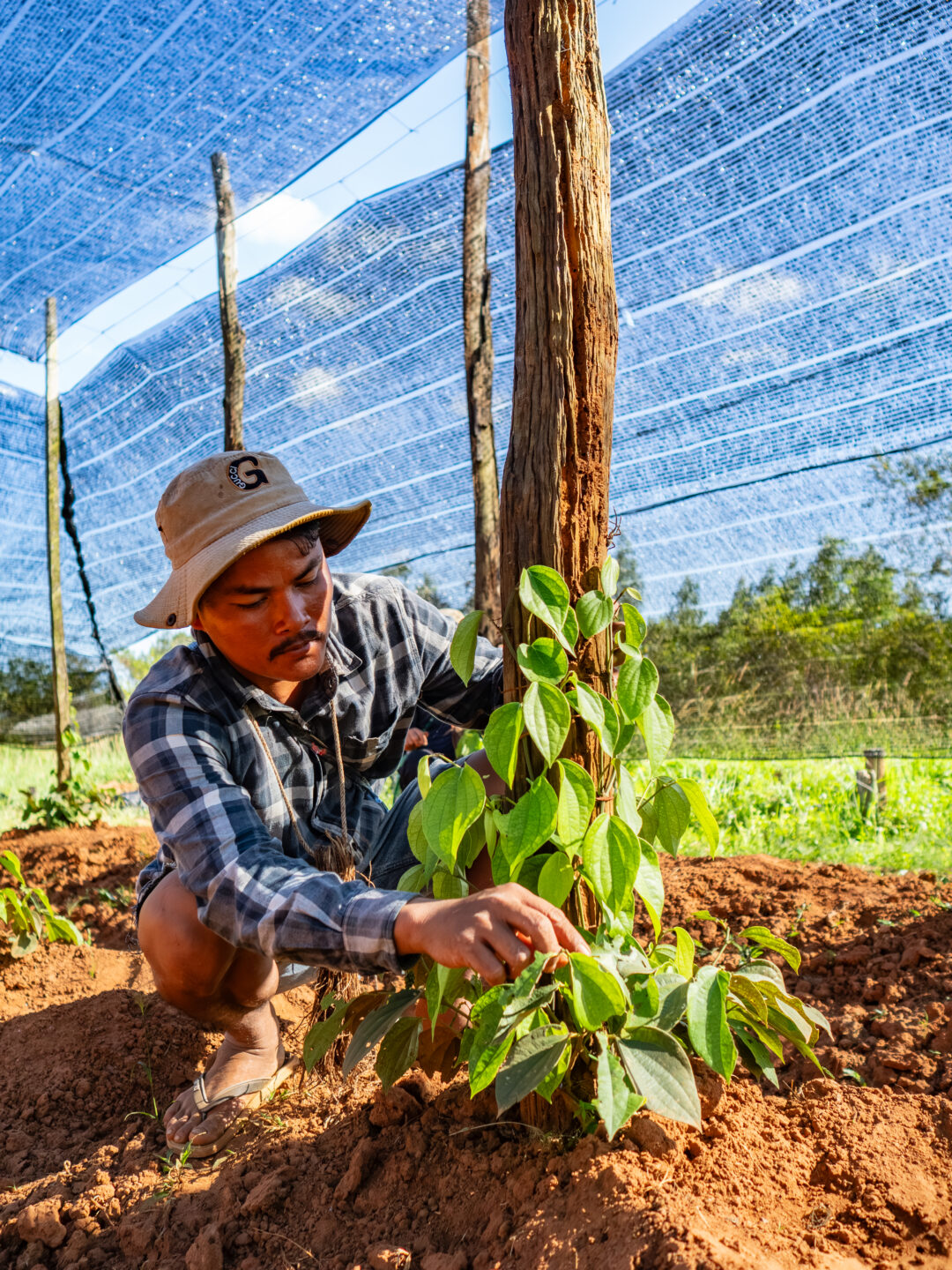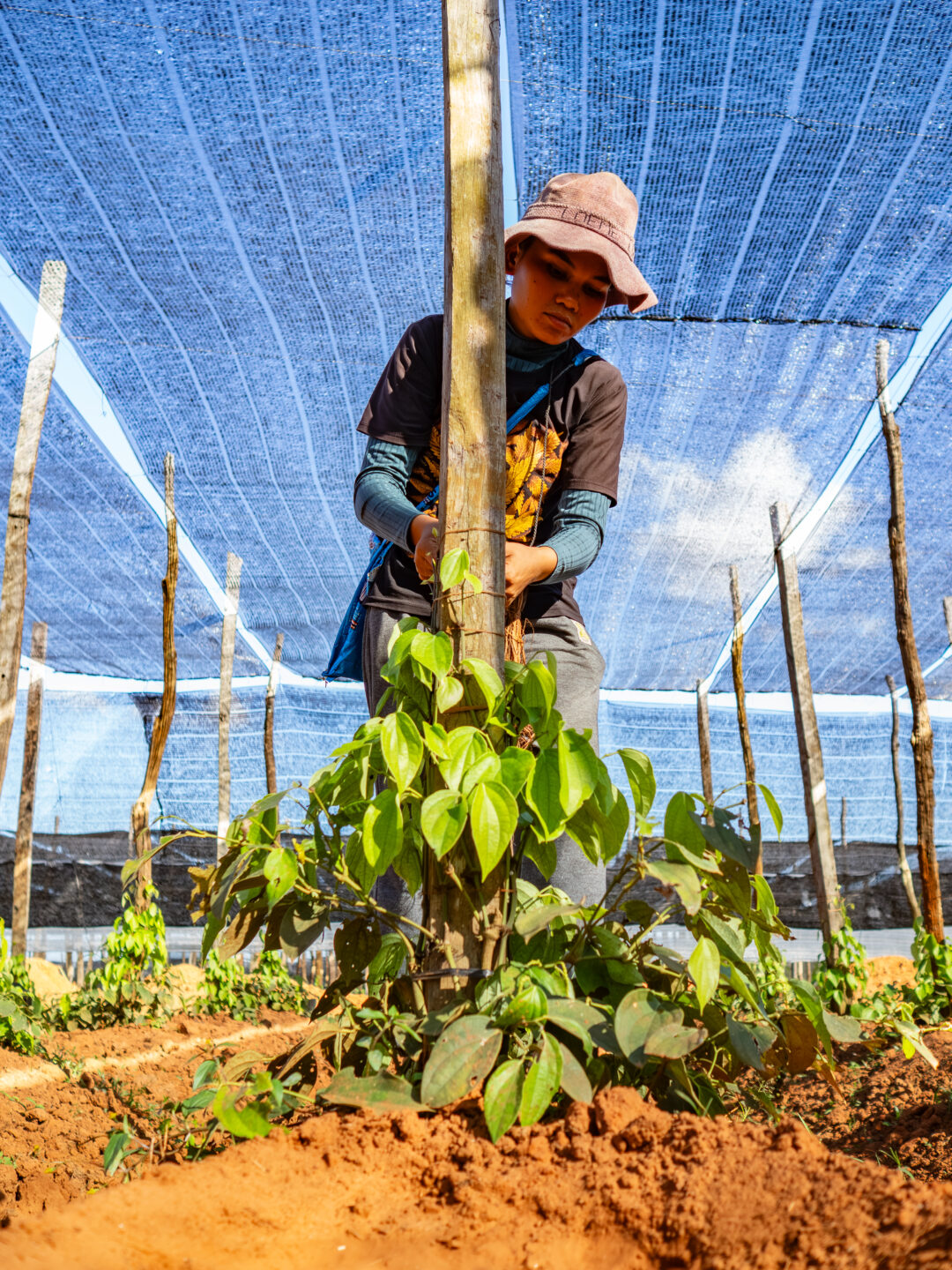 まだ膝下ほどしかない赤ちゃんの胡椒の木を、 胡椒職人さんたちが一本一本、 添え木に固定していきます。