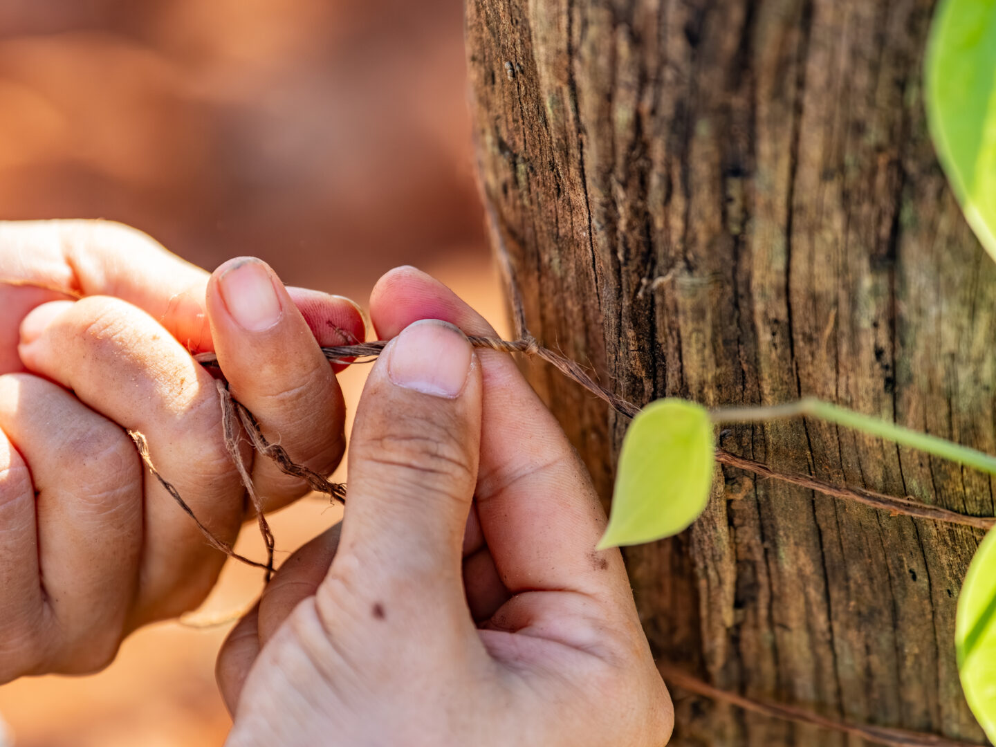 胡椒を添え木に固定する。 言ってしまえばそれだけの作業なのですが、 ここにも職人さんの知識と熟練の技術が生きています。 たとえば、 紐で固定する際に団子結びのようにきつく結んでしまうと、 胡椒の木が成長したときに締め付ける形になり、 成長の妨げになってしまいます。 だから、 しっかり結ぶのではなく、 紐をねじるようにして固定します。 そうすることで、 胡椒の木が成長したときに自然と紐が外れるようになっているのです。