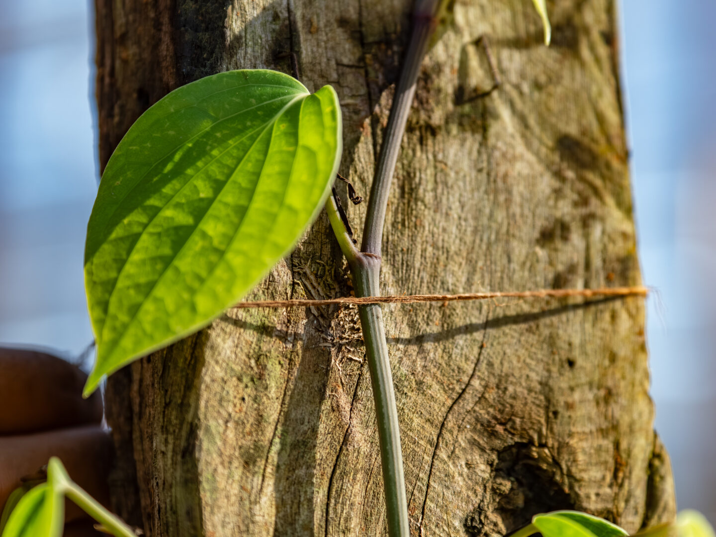 これは、 胡椒の木を添え木に誘引していく作業です。 植物でできた紐を使い、胡椒の木に生える付着根(ふちゃくこん)を添え木に固定していきます。 胡椒の木には節があり、 その節ごとに付着根と呼ばれる、 いわば「胡椒の手」のようなものが生えています。 この付着根が添え木をしっかりと掴むことで、 胡椒の木は添え木に沿って上へ上へと伸びていきます。