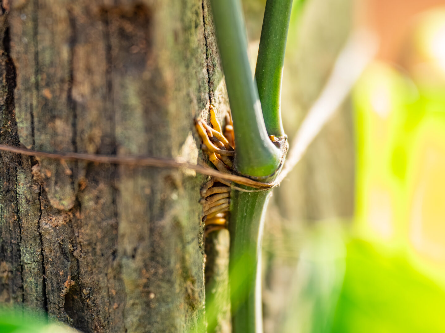 節から伸びている触手のようなものが付着根。 この根が添え木をしっかりと掴むことで、 胡椒の木は上へ上へと伸びていきます。