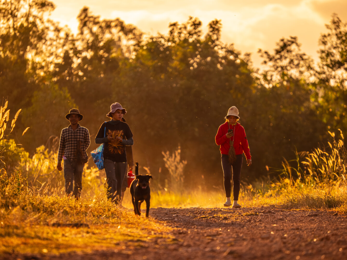 胡椒畑には高い建物がなく、 いちばん高いのは胡椒の木です。 そのぶん視界がひらけていて、 夕陽がとても美しい。 夕陽を浴びながら畑から家へ戻っていく職人さんたちの姿は、 まさにプロフェッショナルそのものでした。 畑の犬たちも走り回り、 テンションが最高潮になっています。