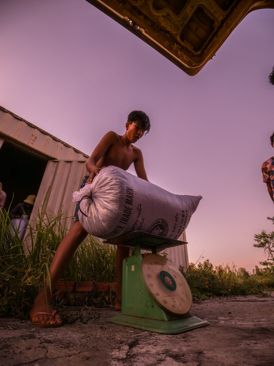 平均して60kgほどある胡椒の袋を何袋も運んでいるのに、 その表情にはまだ余裕があります。 彼はまさに、 胡椒畑のスーパーマン。