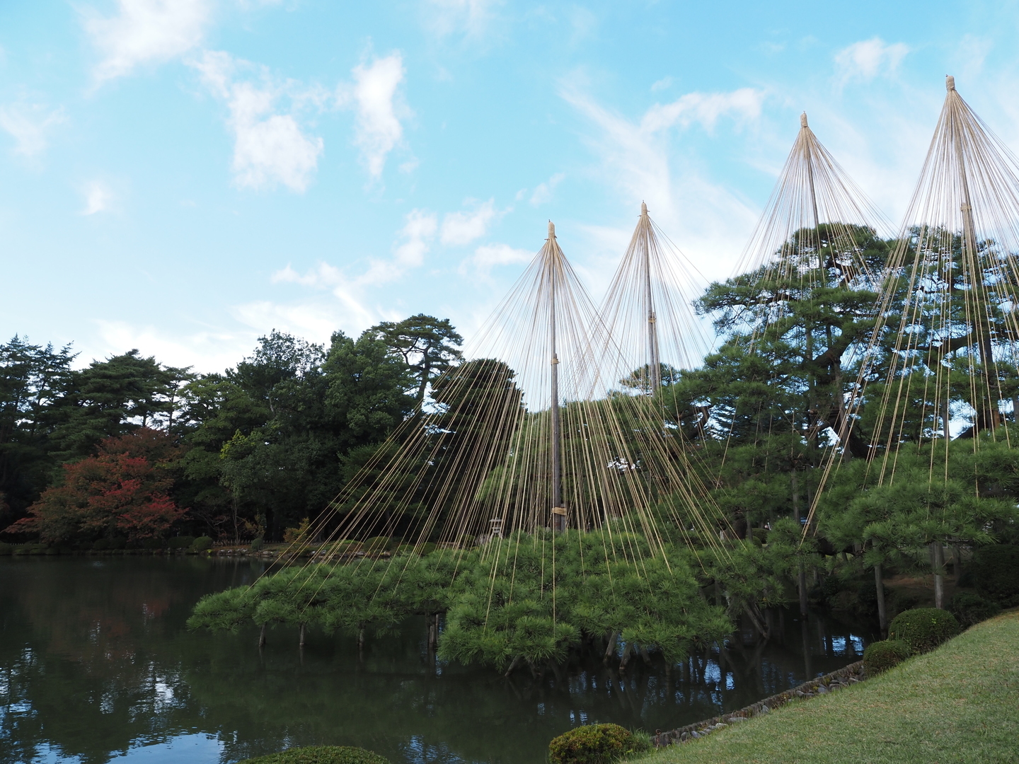 金沢の冬の風物詩ともいえる兼六園の「雪吊り」が設置されていました。この日はちょっと不安定なお天気で、通り雨のあとすぐに晴れ間が戻ったところで撮影。赤のフィルターを濃くしていくことで、青空がどんどん暗くなる一方で、画面左端で紅葉した木が白っぽくなっていくのがわかります。