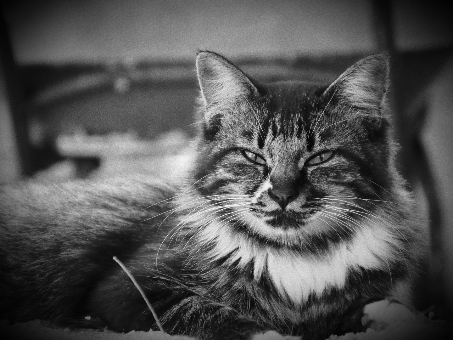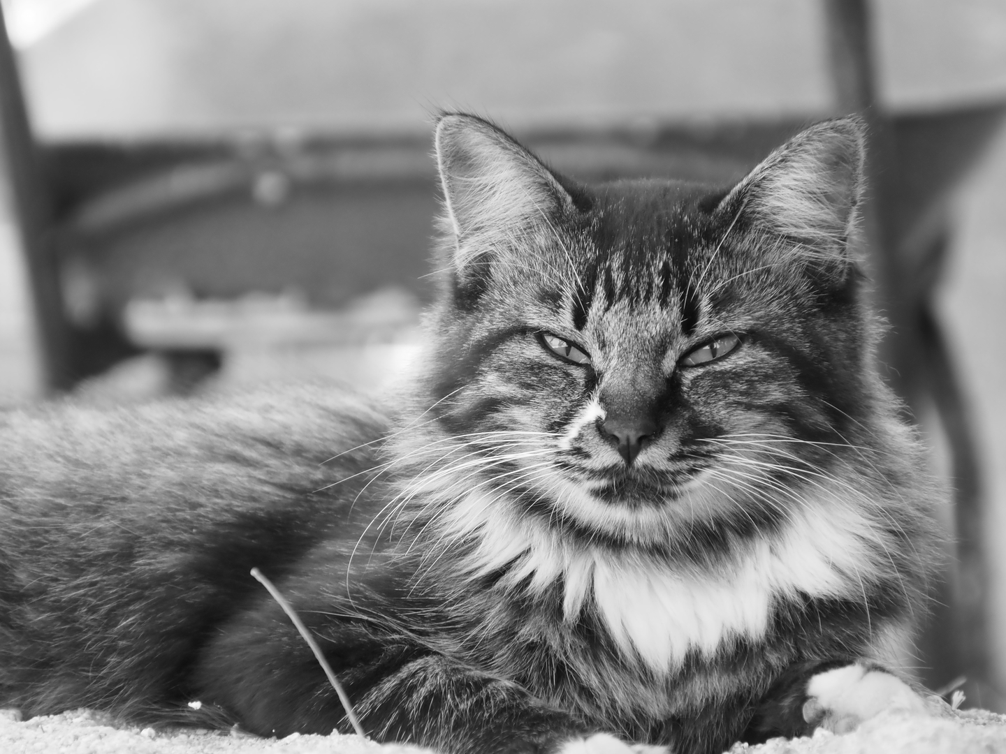 瀬戸内海の小さな島の海辺でくつろぐ猫たちの中に、とても凛々しい一匹がいました。ふさふさで首まわりだけ白い毛並みはまるで襟巻きを巻いているかのよう。その毛並みと対照的な鋭い眼差しでこちらを見据える圧倒的な存在感を伝えるため、モノクロプロファイル2をベースに、シェーディング効果を使ってみました。