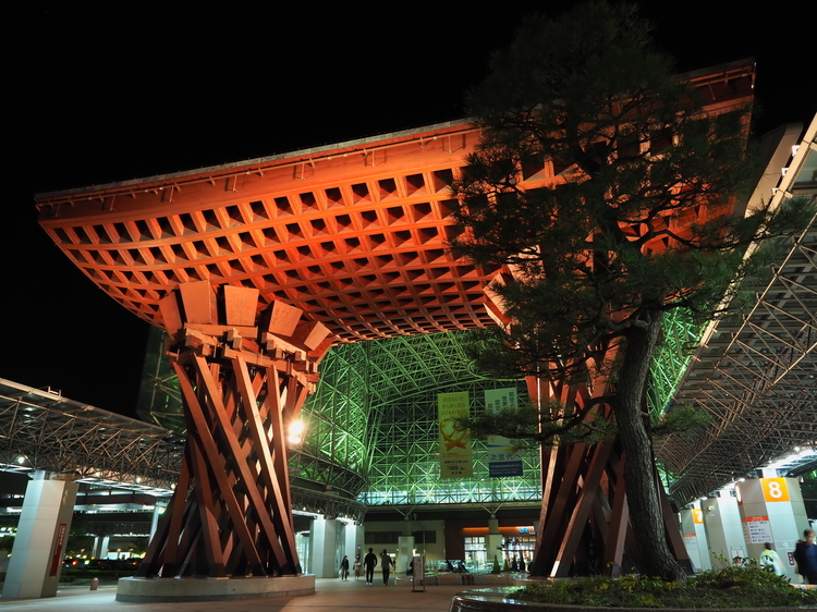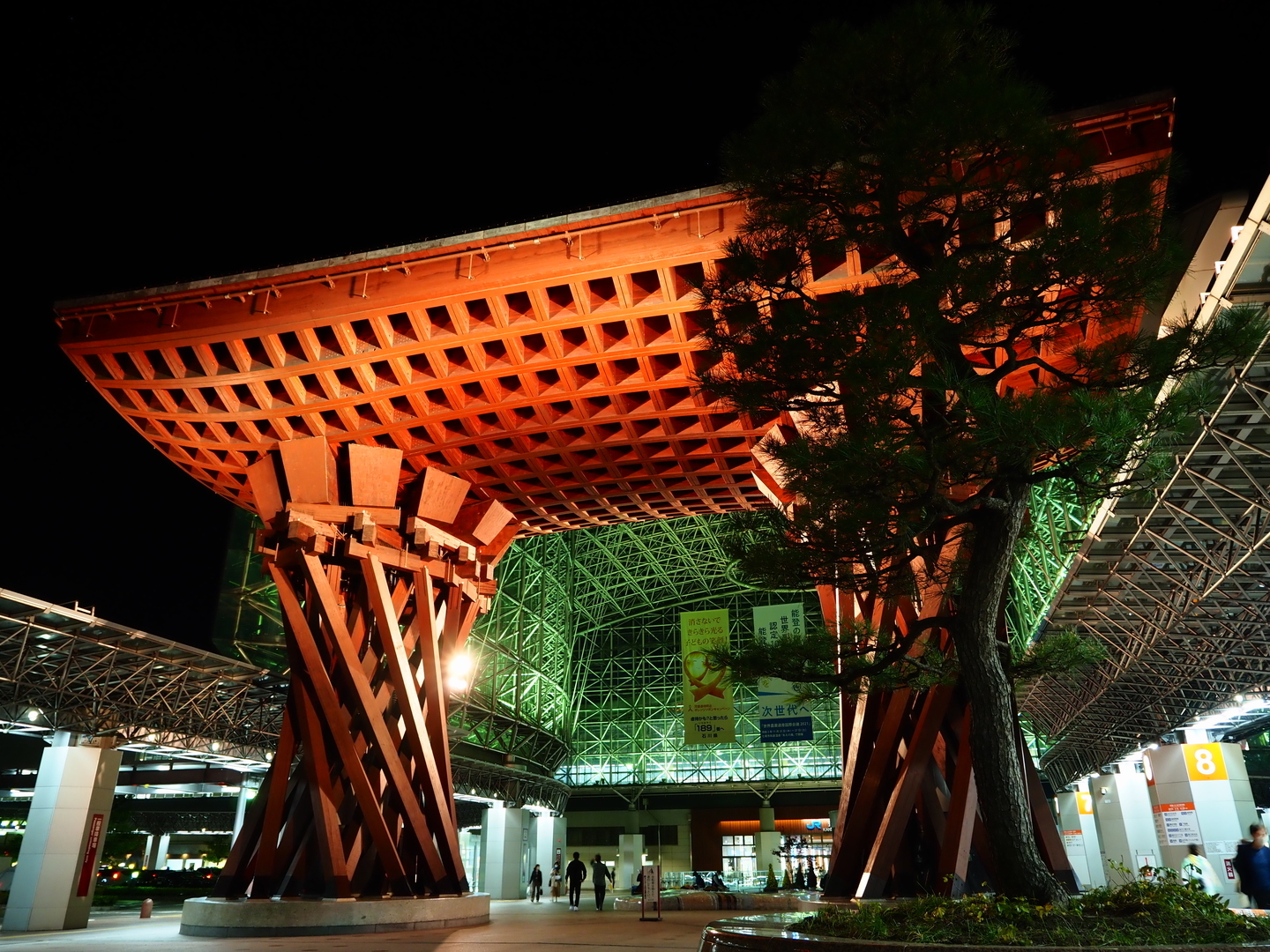 金沢の玄関口、金沢駅にそびえる「鼓門」は夜はライトアップされてなんとも艶やかです。その鼓門も、カラープロファイルの設定によって朱色の鮮やかさと手前の松のディテールが変化することがわかります。カラープロファイル3だと朱色は鮮やかですが、松が黒くなりすぎる。そこでミッドトーンを少し持ち上げてみました。これがカメラ上でできてしまうということがなんとも便利です。ちなみにシャッター速度1/6秒で撮影していますが、この時はあいにくと三脚を持っておらず手持ち撮影ながらも5軸のボディー内手ぶれ補正がしっかり効いてくれています。