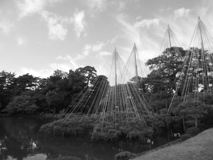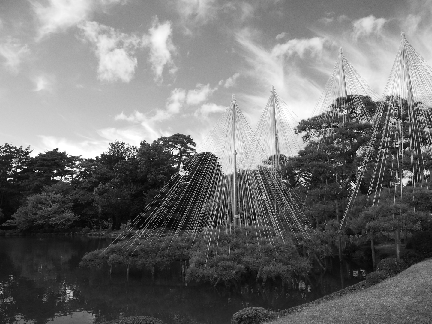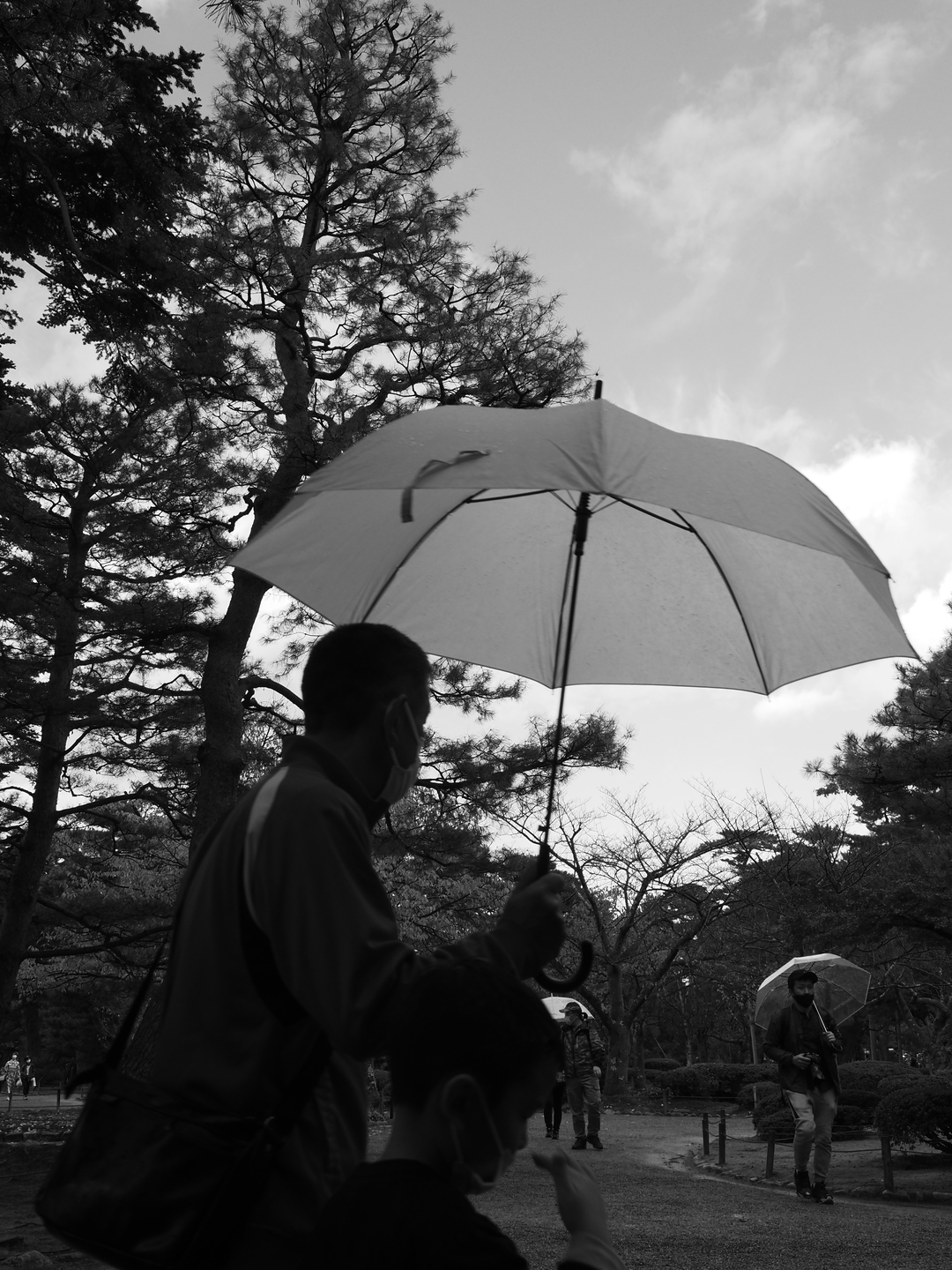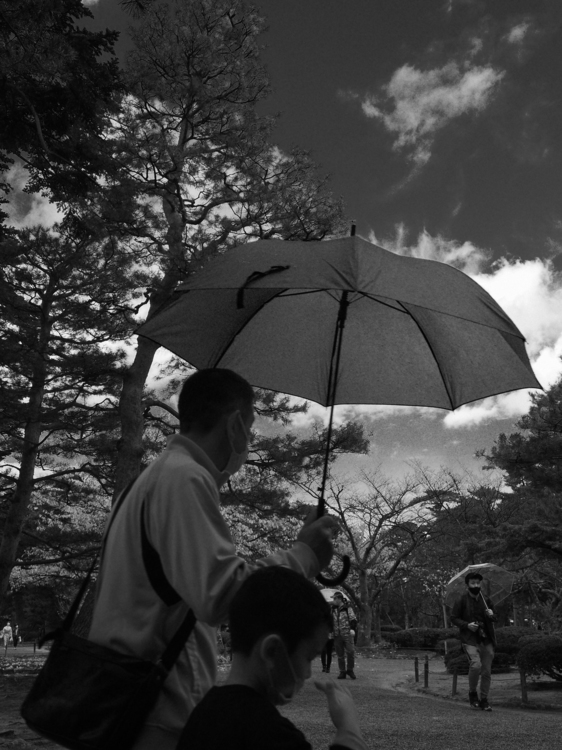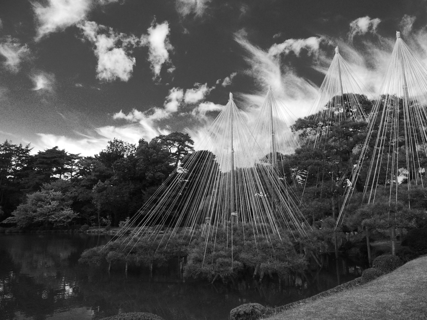兼六園で突然の通り雨。傘など持っていない晴れ女の私(笑)は、軒下で雨宿りをしつつスナップ。「晴れているのに雨!」を伝えるのにこのモノクロプロファイル3はうってつけです。