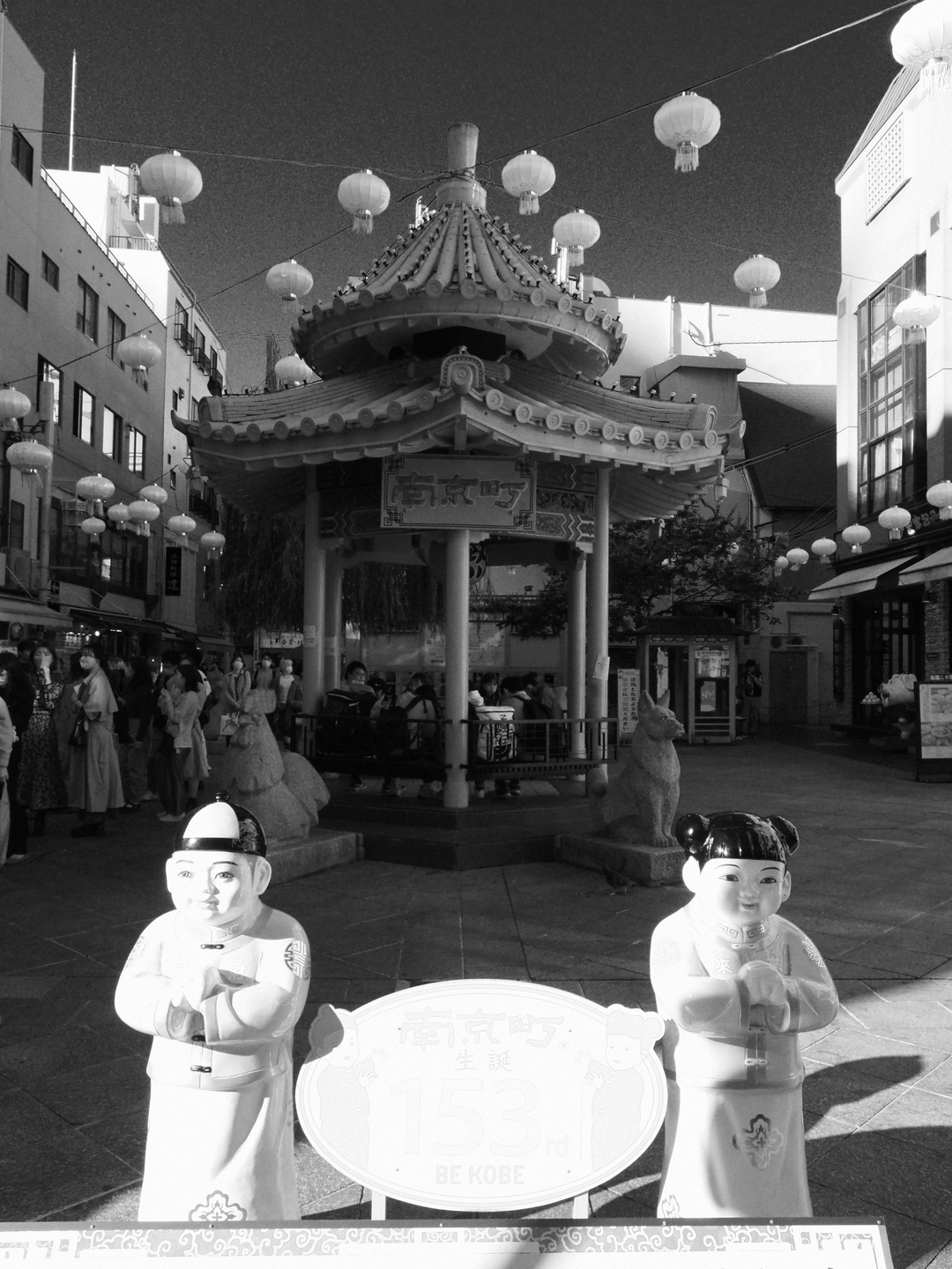 見事な青空が広がる日に、街中、赤が印象的な神戸・南京町で撮影。プリセット内容によってかなり印象が変わることがわかります。赤外フィルムのような効果が得られるプリセット3がやはり印象的ながら、真ん中の看板や左の人形「財財」の顔が白くなりすぎてしまうことから、最終的にハイライト&シャドウコントロールでハイライトをできるだけ下げてシャドウは少し持ち上げてみました。