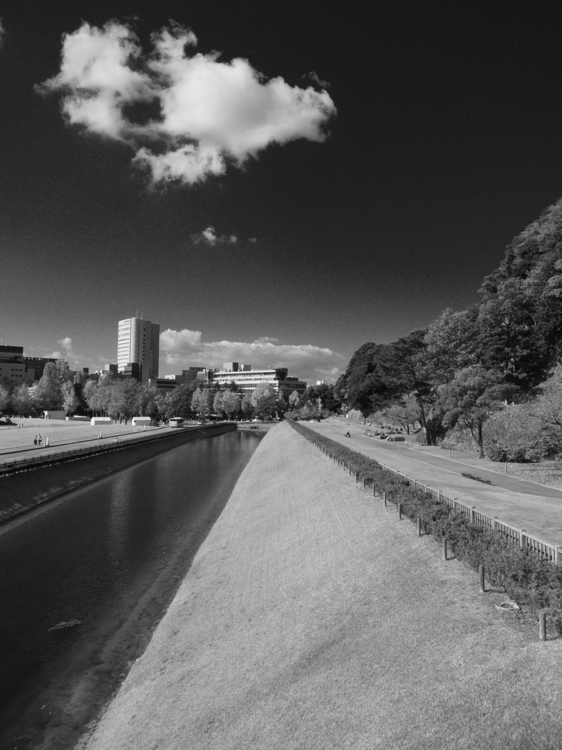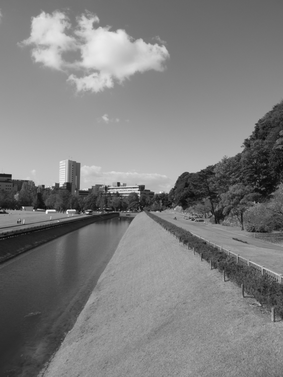 金沢城のお堀端を歩いていると、青い空にぷかぷか浮かぶ白い雲。モノクロプロファイル3の赤いフィルター効果により、空の青さと雲の白さのコントラストが際立ちます。この時ふと、写真家 奈良原一高の、ふたつのごみ罐が宙に浮かんだ作品を思い起こしました。