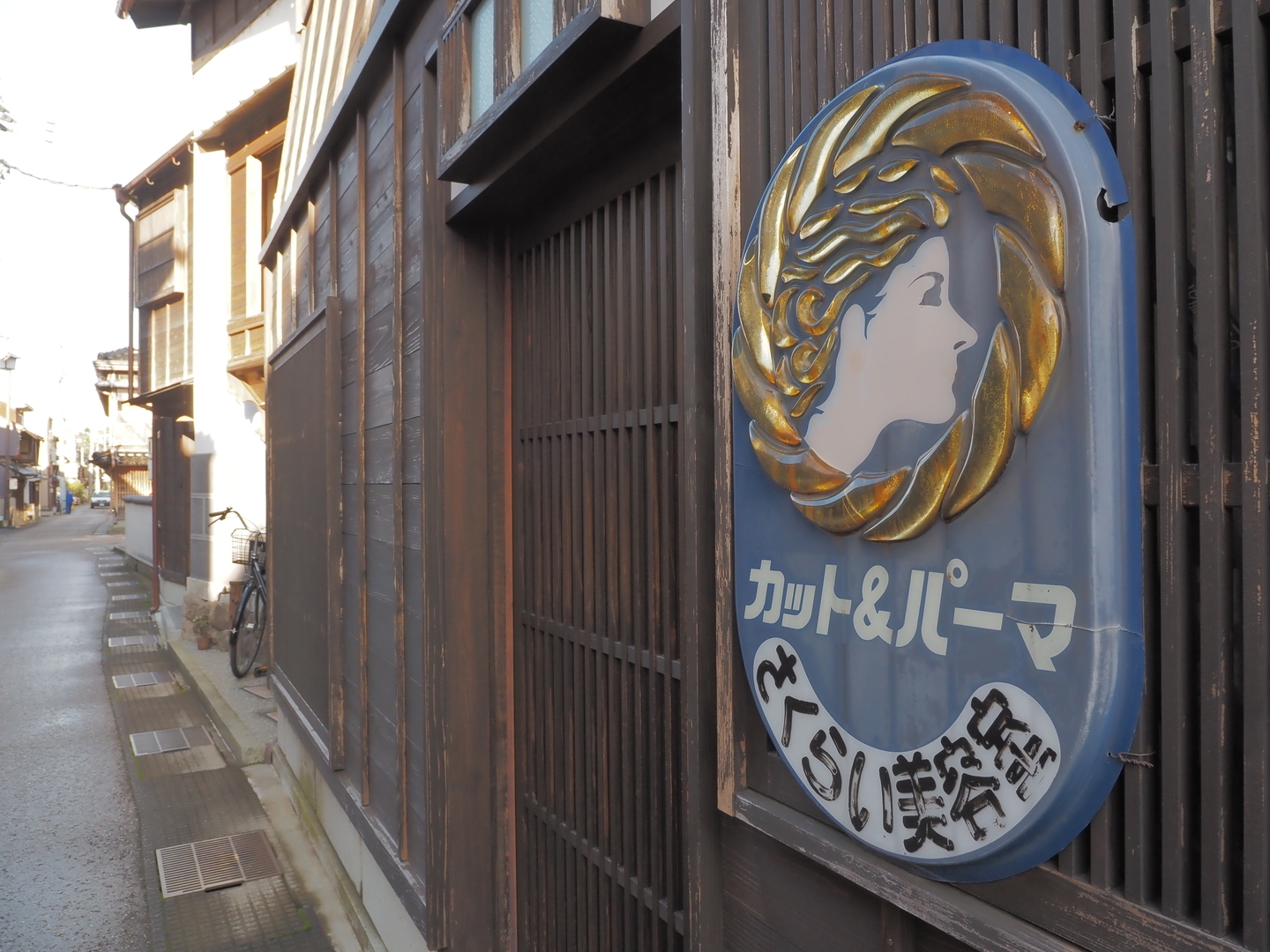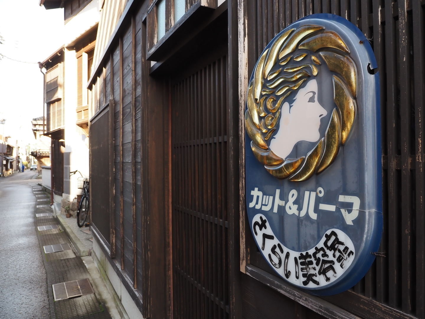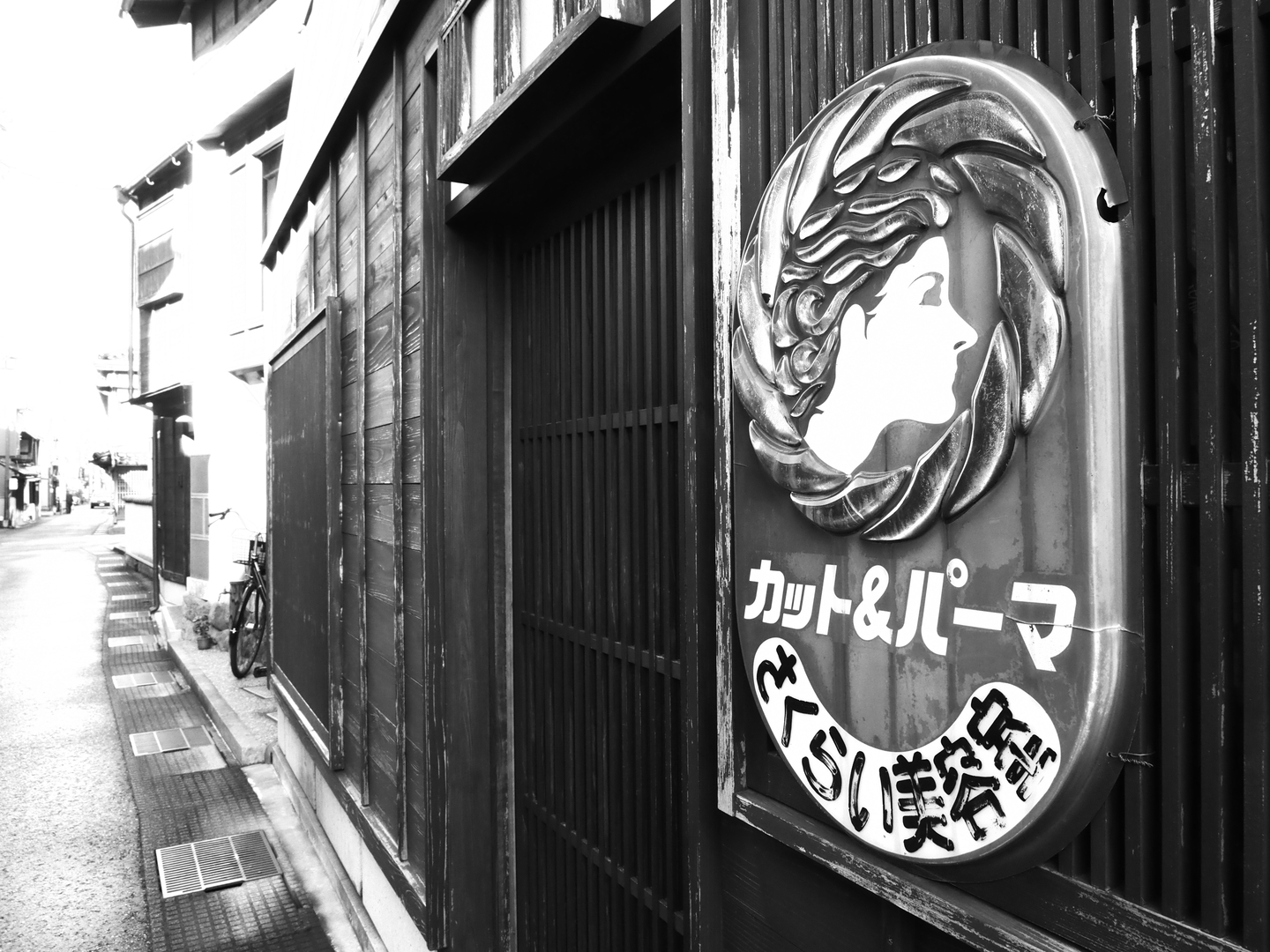 金沢の「ひがし茶屋街」で見つけたレトロな看板。コントラストを変えることで、看板や建物の存在感や印象が変わることがわかります。