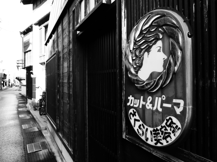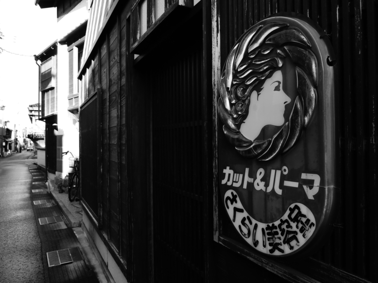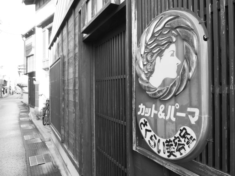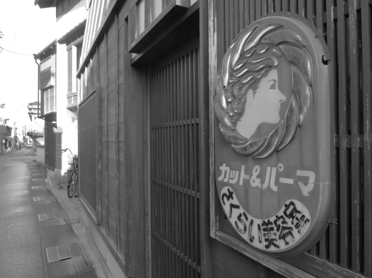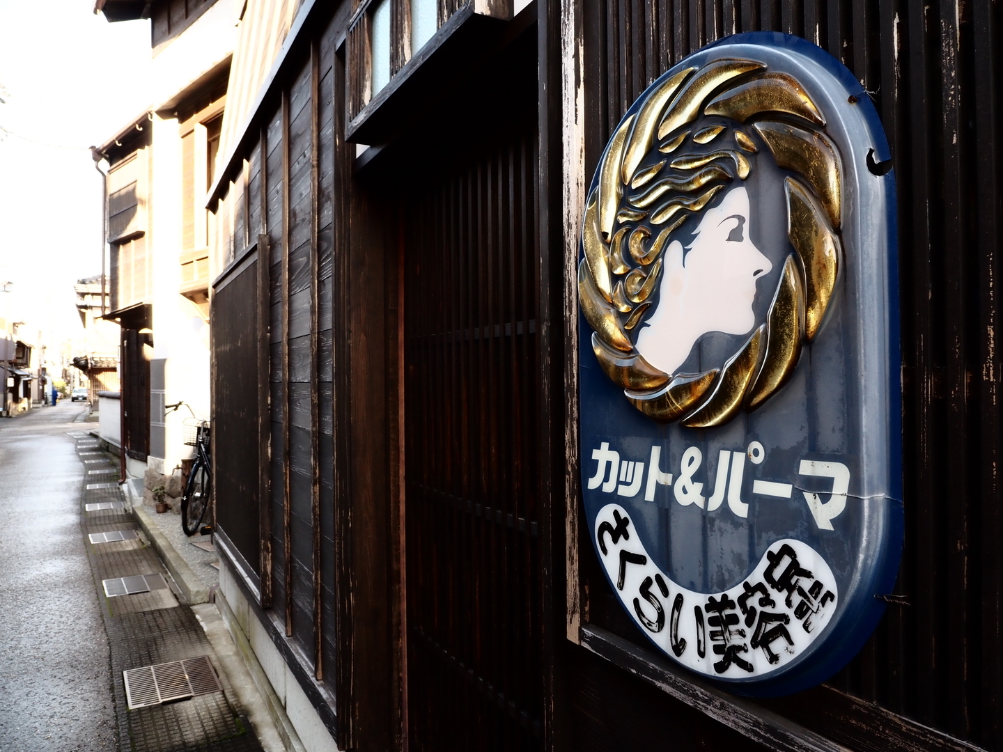 金沢の「ひがし茶屋街」で見つけたレトロな看板。コントラストを変えることで、看板や建物の存在感や印象が変わることがわかります。