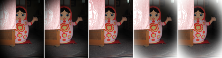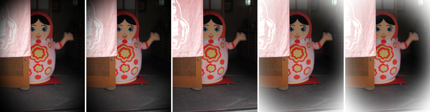 金沢の「にし茶屋街」で、マトリョーシカに似たお人形さんが外の通りに向かって手を振っていました。いつもは周辺減光に使うことの多いシェーディング効果ですが、ここでは白くぼかしてこのお人形さんをまあるく囲むことでなんだか額縁に入っているようにも見えます。