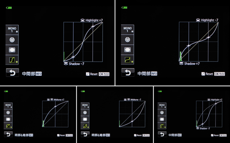 今やPEN / OM-Dのいずれの機種にも搭載されているハイライト&シャドウコントロール。一般的には撮影後に画像処理ソフトを使って行うことが多いと思われるトーンカーブの調整が、カメラ上で、しかも撮影時にできてしまうというこの機能。全機種共通の「スーパーコントロールパネル」からの設定が可能な他、このプロファイルコントロール機能からも簡単にアクセスできます。