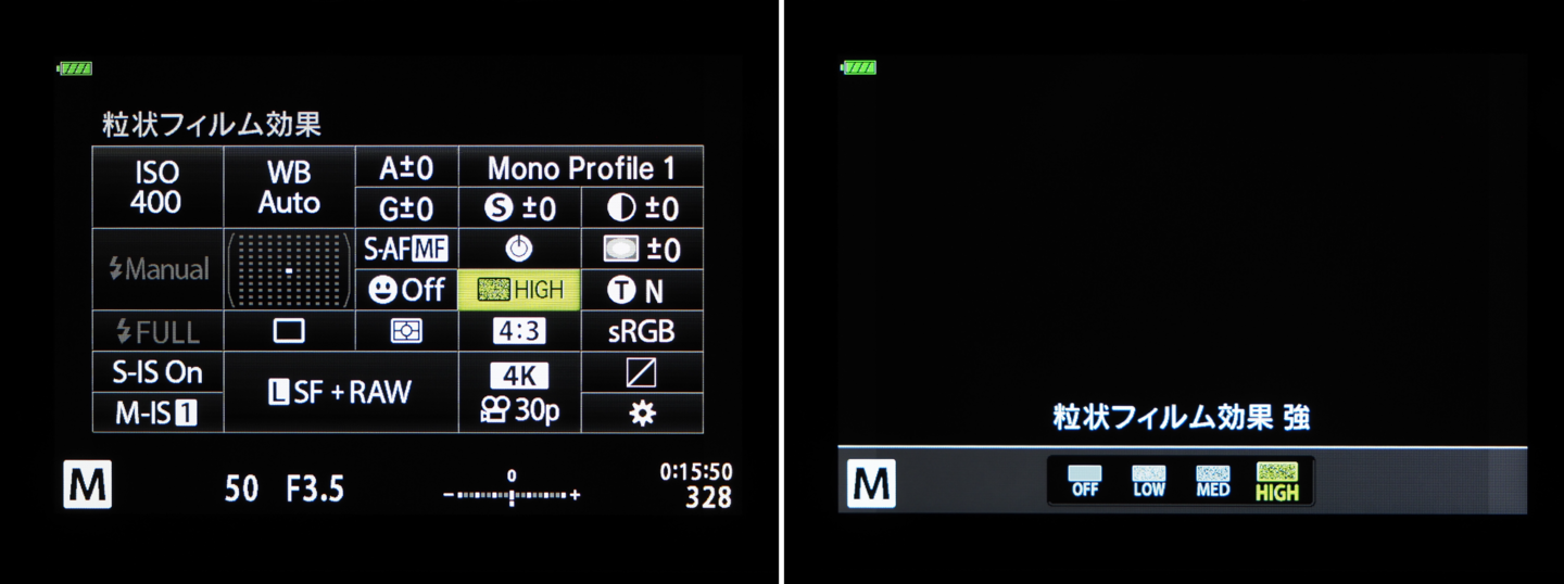 モノクロの銀塩フィルムのようにザラッとした粒状感を加えるこの機能。OKボタンを押して呼び出す「スーパーコントロール」で「OFF」「LOW(低)」「MED(中)」「HIGH(強)」から簡単に設定できます。ただし撮影後に画像処理で足されるため、設定時(撮影時)にライブビューモニターには反映されないのでご注意を。再生画面で仕上がりをチェックしましょう。