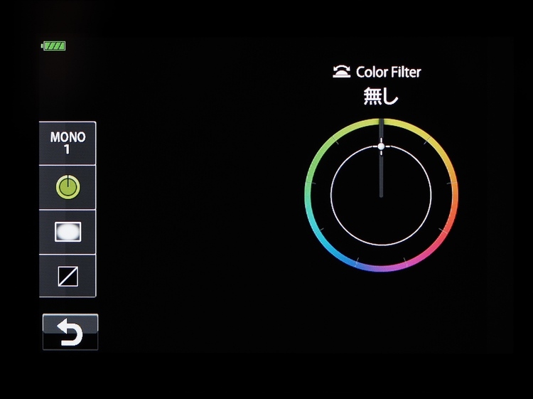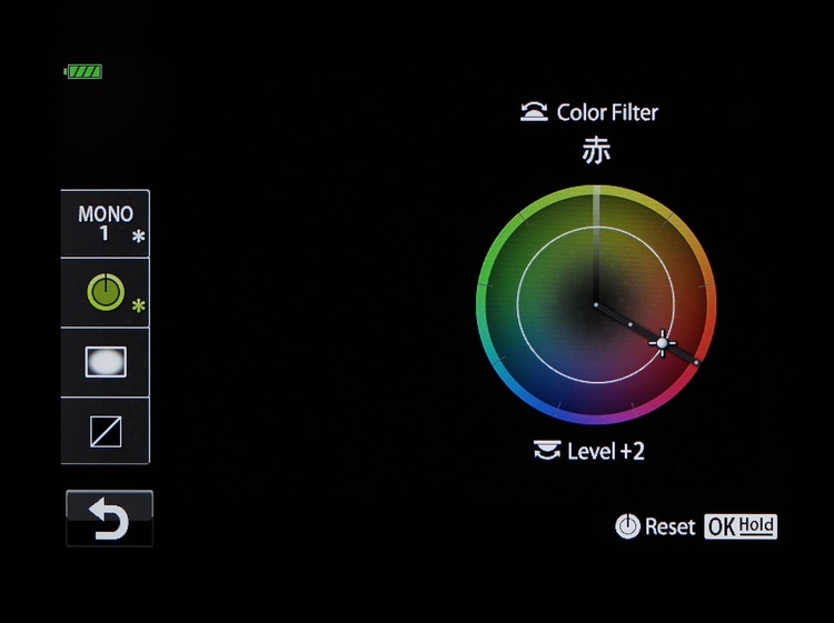 モノクロ撮影時にレンズの先端に装着するカラーフィルターが内蔵されたイメージで、フィルターを何枚も持ち歩かなくて済むのは非常に有難いですね。尚、フィルター効果は通常のモノクロ設定であるピクチャーモードの「モノトーン」でも、OKボタンを押して呼び出す「スーパーコントロール」で「なし / 黄色 / オレンジ / 赤 / 緑」を選択することが可能です。(ただし効果の調整はできません)