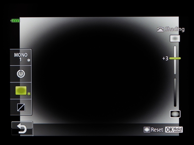 写真の四隅を暗く落としたり、反対に白くぼかしたりするシェーディング効果。写真を見る人の視線を真ん中に誘導し、被写体を強調する効果があります。もともとはアートフィルターの効果の追加で登場したものの特定のアートフィルターでしか使えませんでしたが、PEN-Fのプロファイルコントロールでこの機能が搭載され、E-P7にも引き継がれています。アートフィルターを使わない写真でもこの効果を足せるようになったこと、そして効果の強弱を黒白それぞれ5段階で調整できる点がとても使いやすいですね。尚、あれこれ変更した設定は、OKボタンの長押しであっという間に規定値に戻してくれます。(後述の設定もすべて同様です)