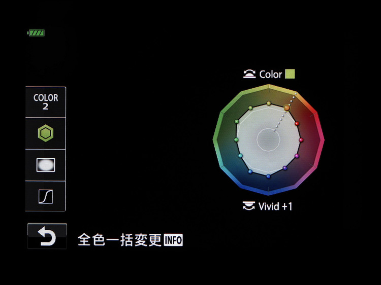 カラープロファイルコントロールでは12色の色相環からフロントダイヤルで調整したい色を選び、リアダイヤルで彩度を調整します。また、すべての色の彩度を上げたり下げたりしたい、そんなときはinfoボタンを押すことで全色を一括して調整することができます。また、ここでもやはりOKボタンの長押しで、すべての項目をまとめて瞬時に規定値へ戻すことができます。便利!