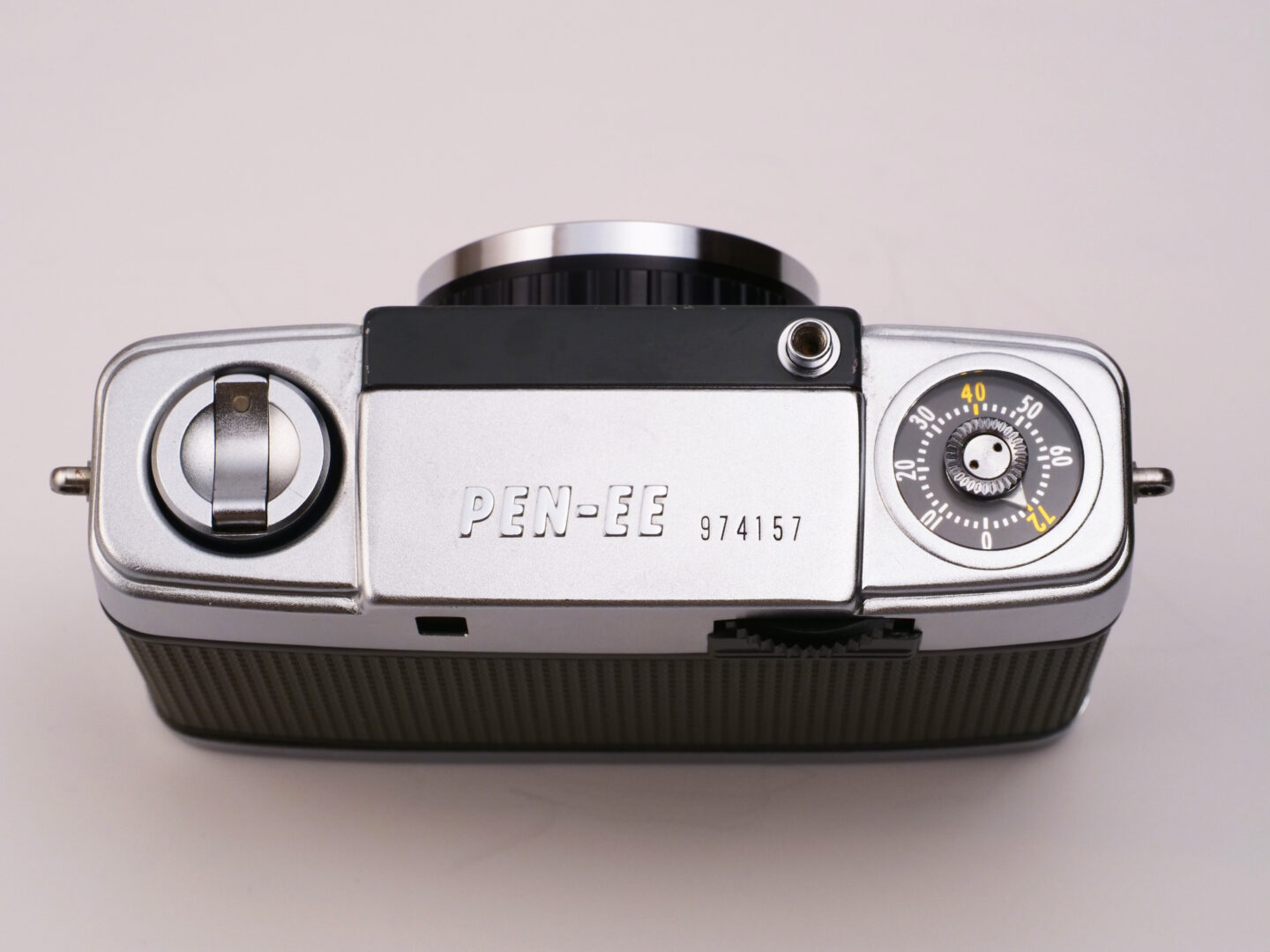 ペンEESは17×24ミリの面積に露光するハーフ判カメラです。いわゆるライカ判(フルサイズ)36×24ミリの横幅を半分にしているので、2倍のコマ数が撮影できます。というわけでフィルムカウンターには72コマ以上がカウントできるように数字が刻まれていて、36枚撮りのフィルムを装填すると、『まだフィルム終わっていなかったっけ?』と思えるほどのショットが撮影できます。ペンシリーズを設計したオリンパスの米谷美久さんの卓越したアイデアで、フィルム巻き上げとフィルムカウンターを作動させる部品構成は極めてシンプル。親指でフィルム巻き上げディスクを操作すると伝わってくるラチェットギアの感触も、よく整備された機体ではとても心地よいものです。