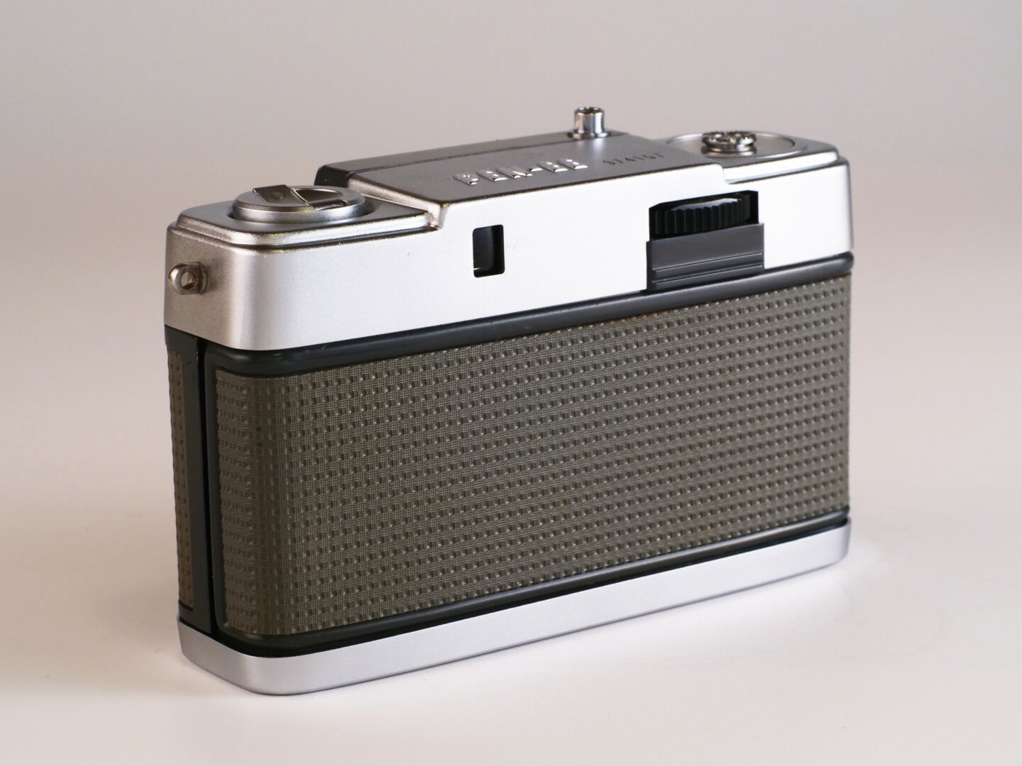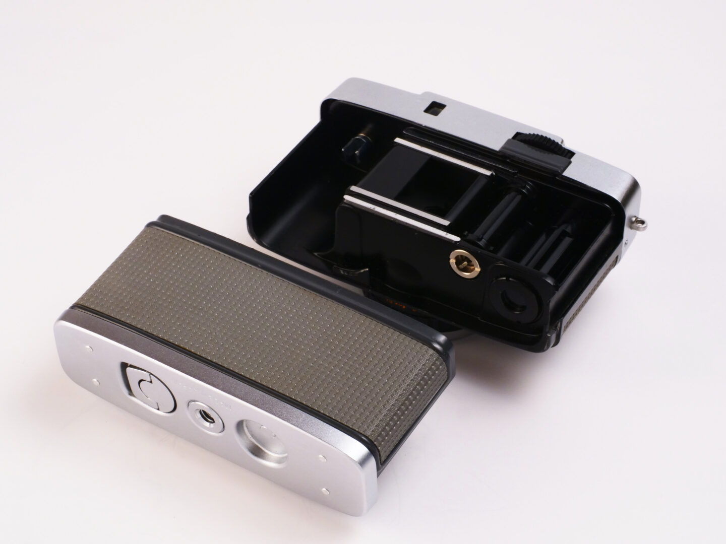 ペンEESにフィルムを装填するにあたり、まずカメラの底蓋にあるロックキーを起こして回転させ、そのまま下に引き抜くように滑らせると裏蓋と底蓋が一体化したパーツがパカっと外れます。これは戦前のレンジファインダー機であるコンタックスや戦後まもない時期の高級コンパクトカメラであるコンテッサなどが採用していた様式で、設計者のこだわりが感じられる部分です。ペンEEのシリーズでは後継機種になると普通の蝶番式で裏蓋だけが開閉できるスタイルへと変更されていきます。