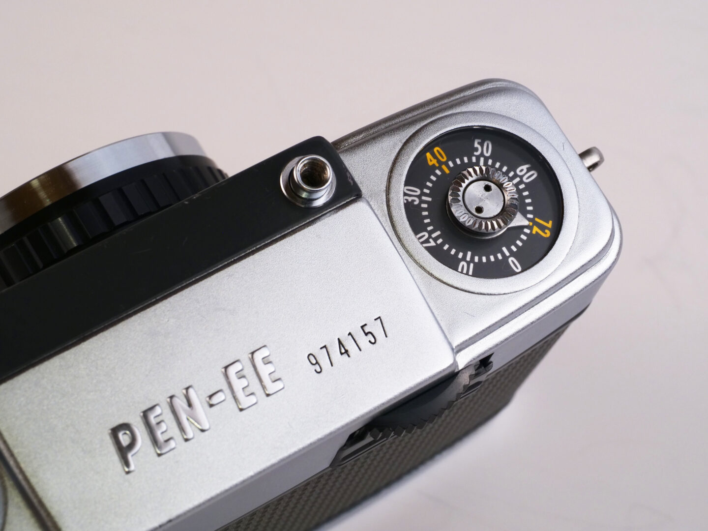 こちらがペンEESを後ろから見た様子です。フレーミングは小さな縦長の小窓を覗き込むとアルバダ式でおおまかな撮影フレームが黄色く光って見えるファインダーで行います。特に撮影情報はファインダー内に示されることはなく、露出アンダーになってしまう場合にだけ、赤いベロが視界の下からヌゥ〜と現れてレリーズしてもシャッターがロックされる仕組みです。そうなったらフラッシュを焚いてくださいということですね。映画の中ではアベイラブルライトの柔らかい自然光に満たされた室内で撮影が進み、横長の画面でのシークエンスを意図したシャルロットはペンEESを水平ではなく90度回転させた構えで撮っています。このシーンがあるおかげでカメラの天面が画面に映り、ホットシューのない初期型のEEモデルであることが判明したという次第です。