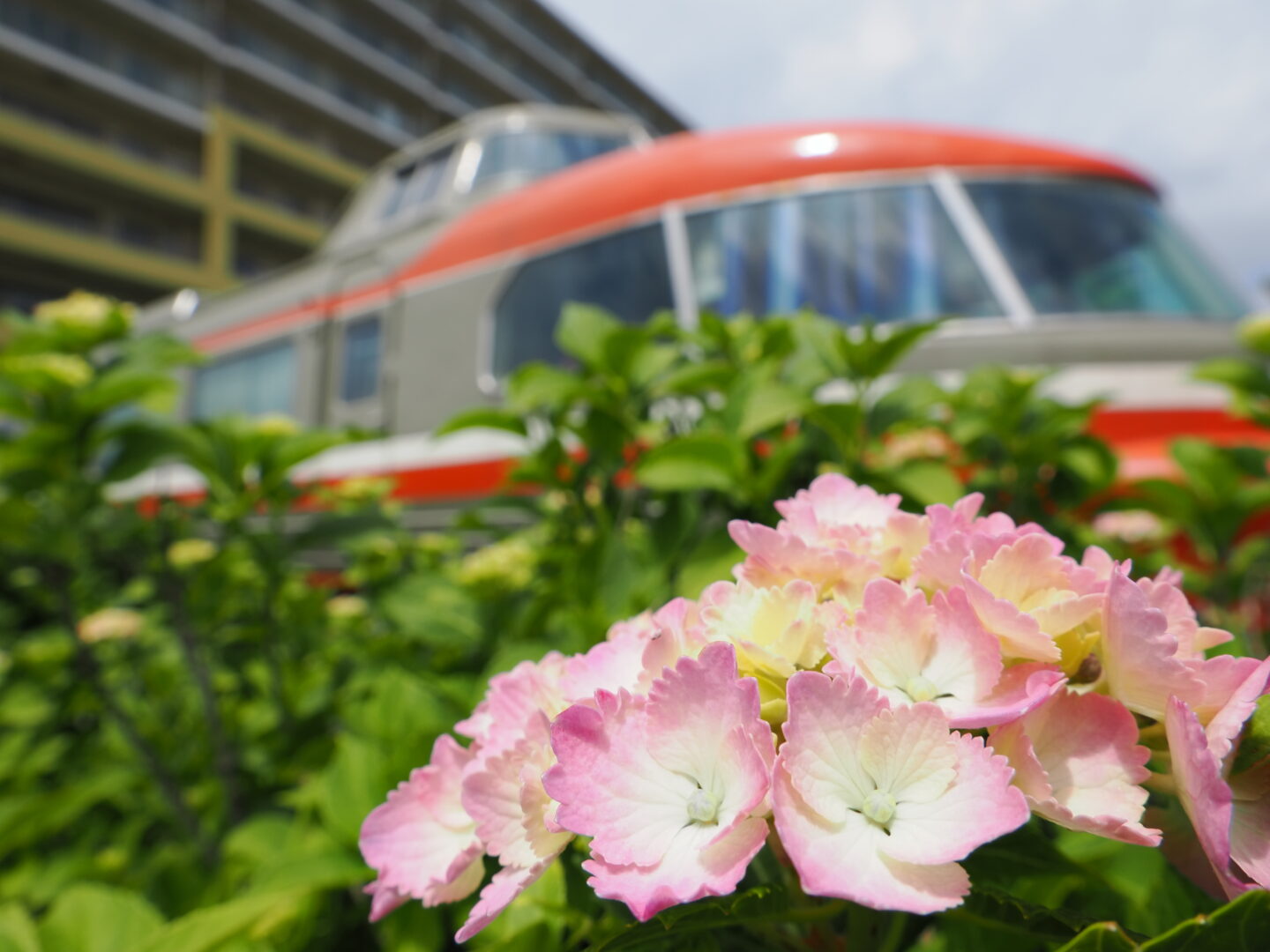 あじさいで有名な神奈川県開成町の駅前での撮影です。35mm判換算24-400mm相当をカバーする高倍率ズームレンズの広角で、背景に鉄道車両を入れながら目の前のあじさいに近づいて撮影します。背景の鉄道車両がボケすぎないよう、カメラ本体のプレビューボタンを押して、被写界深度を確認しながらF8.0で撮影しました。
