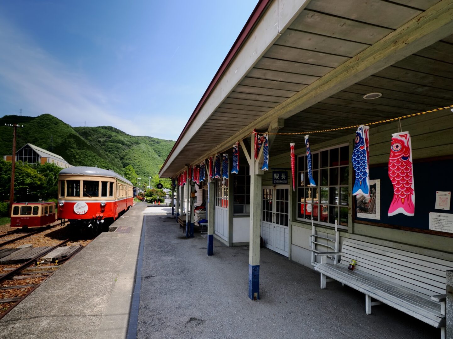 以前、ゴールデンウィークの時期には吉ヶ原駅でイベントが開催されていたこともあり、何かしら当時の雰囲気が感じられるのではないかと思い、5月に再び訪れました。ホームにはこいのぼりが飾られ、ディーゼルカーが入線し、車内が開放される光景は、まさに現役時代を思わせるものでした。