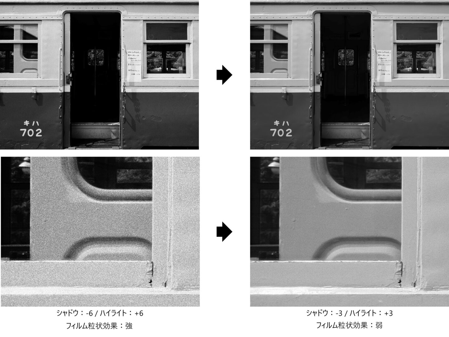この設定で撮影してみると、シャドウ部が持ち上がり、粒状フィルム効果もなめらかになることで、コントラストが適度に抑えられました。結果、全体のトーンが落ち着いたやわらかな階調になり、より自分のイメージに近い仕上がりになりました。