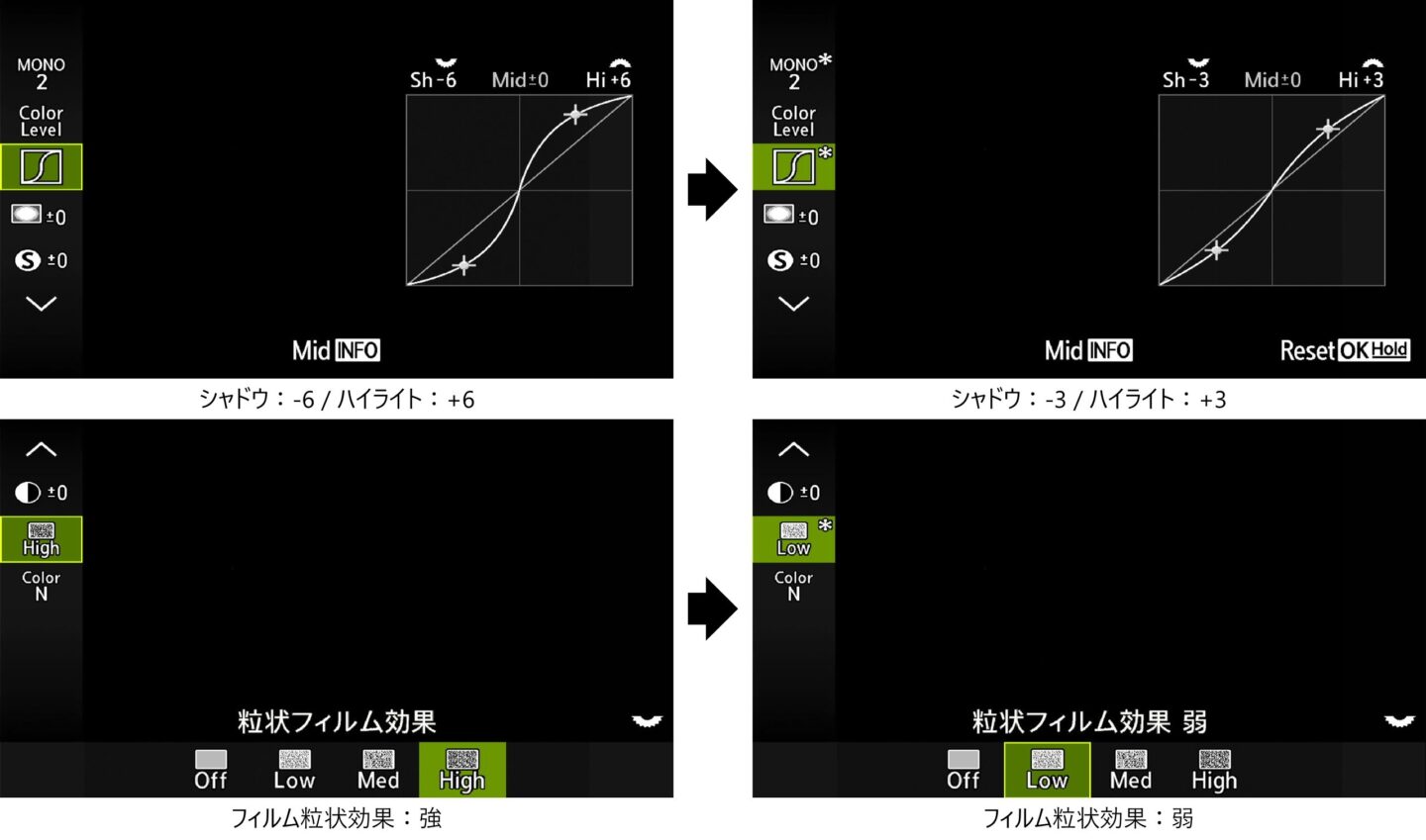 (3)粒状フィルム効果:強 → 弱
