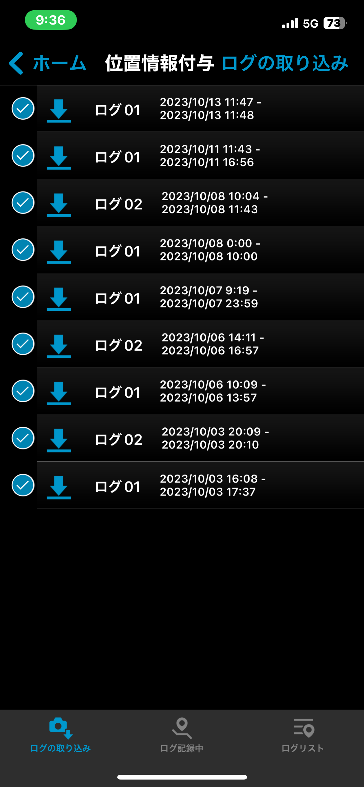 表示された画面から「ログの取り込み」を選択するとカメラ内のメモリーカードに記録された位置情報のログファイル一覧が表示されるので、取り込みたいログファイルを選択しダウンロードを行う。