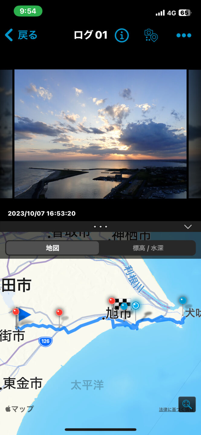 ログリストから確認したい画像を選択すると撮影画像と共にGPSトラッキングで記録された経路が地図に表示される。