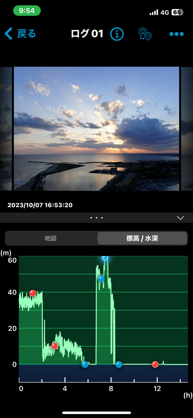 GPSトラッキングと同時に記録された標高/水深情報も表示可能。水中撮影時の水深も水圧をもとに表示される。