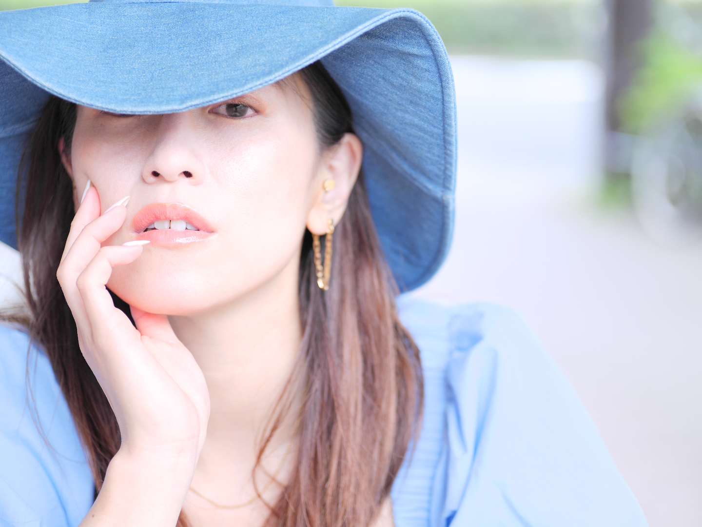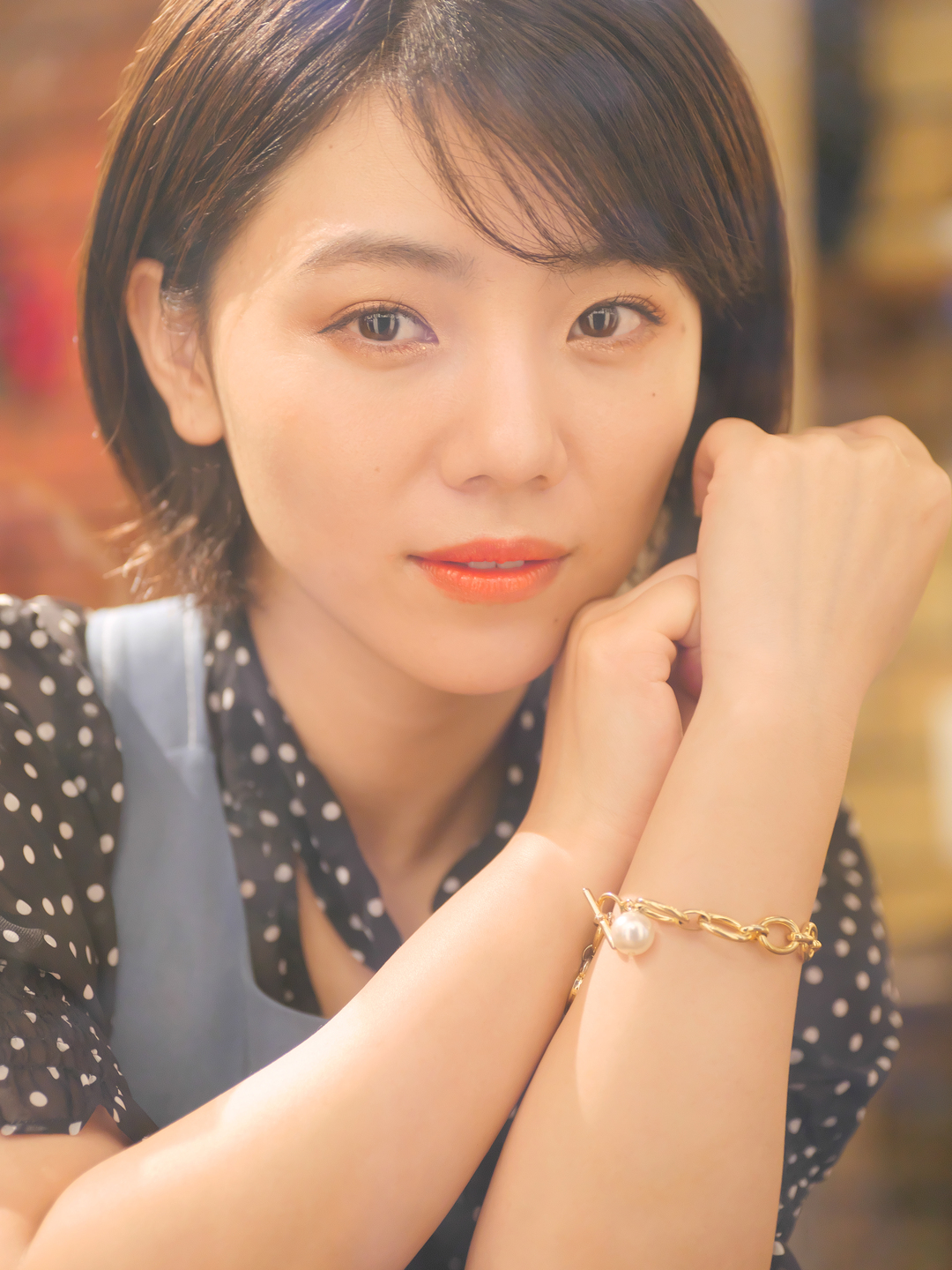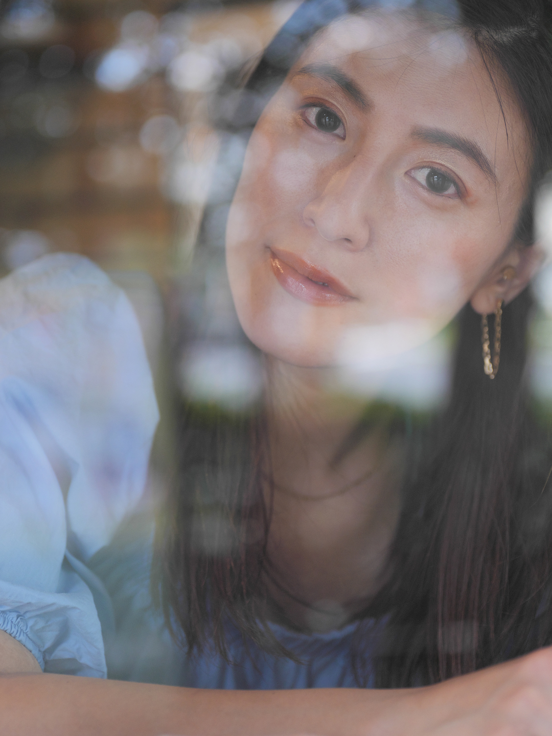 店内のモデルをガラス越しに外から撮影。窓ガラスに写り込んでいるのは筆者の後ろにある木の木漏れ日と、その後ろにある道路を走る車の反射です。今回の撮影場所は反射や点光源が沢山あったので、ボケを存分に楽しむことができました。