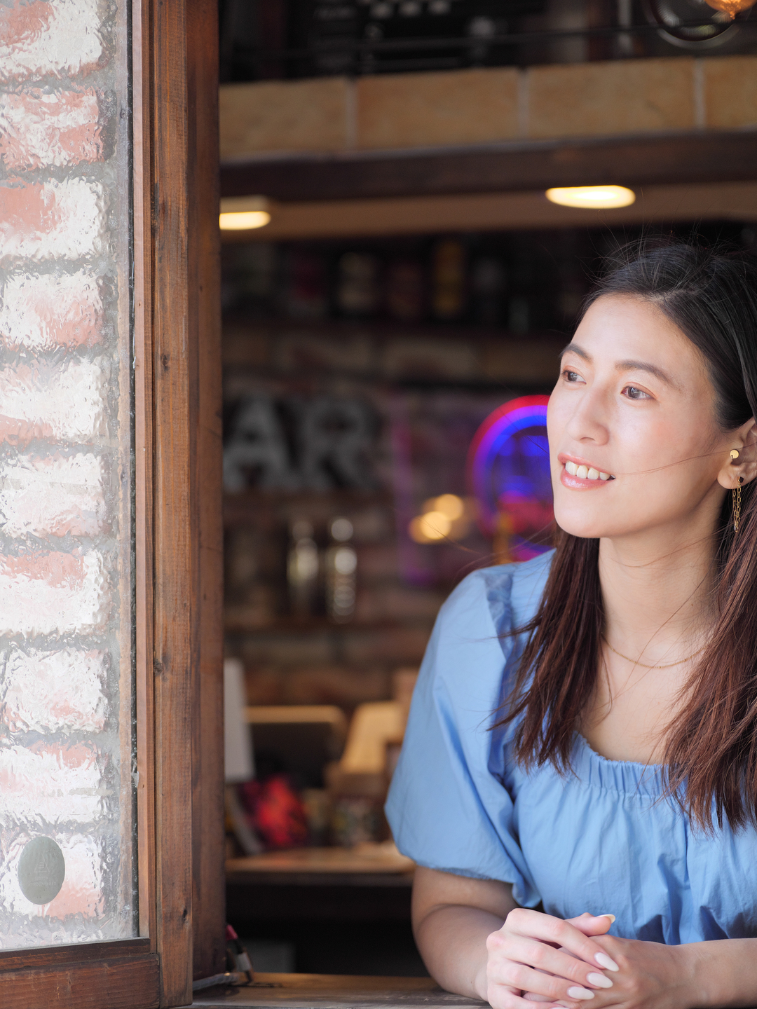 室内は赤みのある照明で彩られているので、背景とモデルの髪は赤味がかった色に、まだ日が落ちていない夕方で、モデルの顔は自然光でうっすらと照らされている為、5000Kのホワイトバランスにすることで、ムードを残しながらも自然な色味になりました。