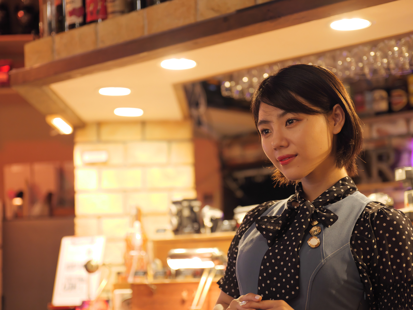 先ほどと同じ場所で、日が沈んでから撮影しました。木漏れ日の反射がなくなり、店内の光が強くなったので、1枚フィルターを通したようなふんわりとしたカットに仕上がりました。