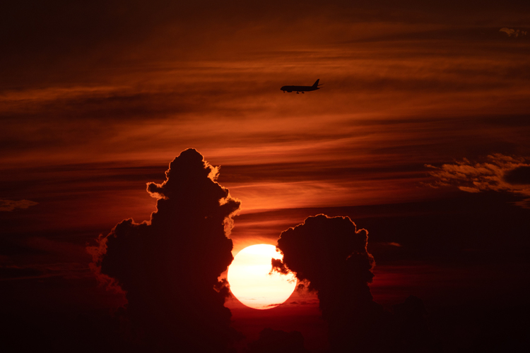 雨上がりの一瞬に顔を出した太陽と着陸態勢に入った飛行機をシルエットに入れて撮影した。GH5IIに採用されたARコートを施したセンサーは、PL・NDフィルターを使用せずとも輪郭のハッキリした夕日が撮影できるのでありがたい。