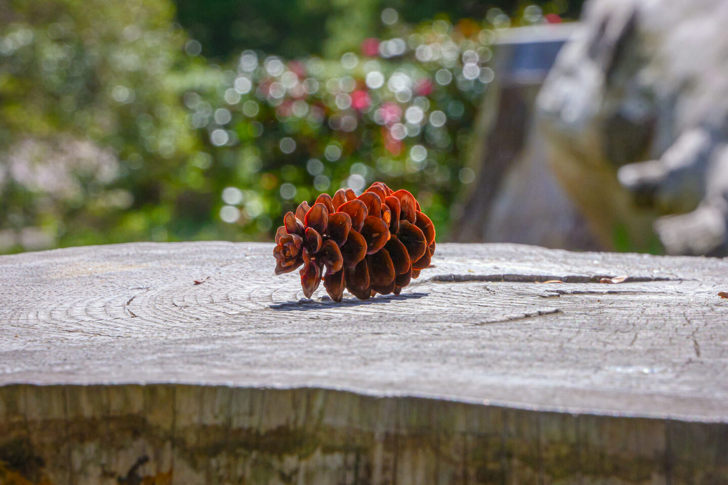絞ることによってピント面が深くなっている事が、松ぼっくり下の年輪を見ると解ります。それと共に解像感がかなりアップしている事も確認出来ます。玉ボケは、より美しくなりますが少し小さくなっています。