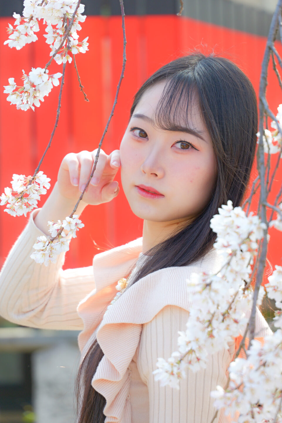 再び京都にて、咲き始めた桜と衣織さんを望遠端200mm、絞り開放F7.1でバストアップポートレートです。一番手前の桜がディテールを残しつつも柔らかくボケているので、優しい印象と程良く被写体の衣織さんを浮かび上がらせて良い感じです。
